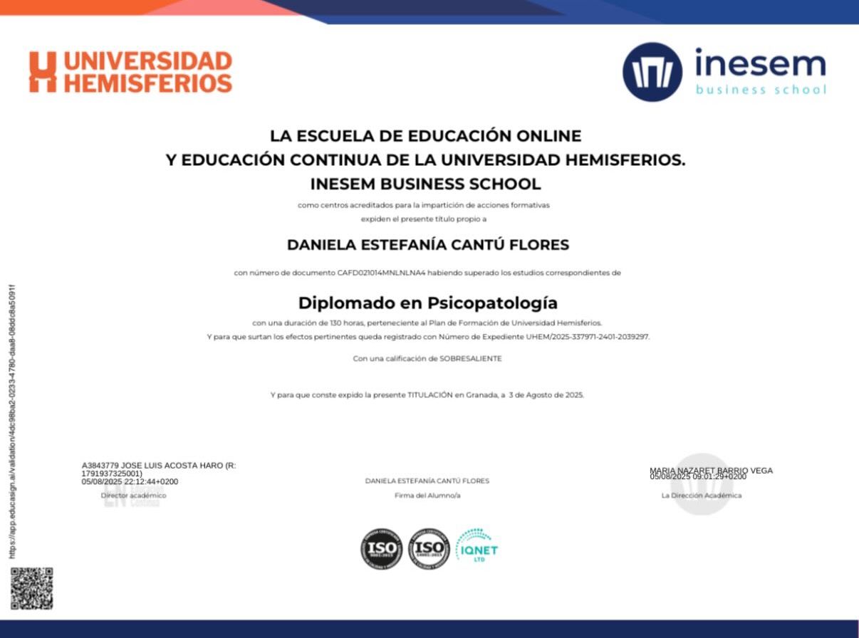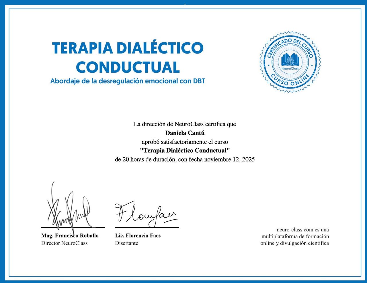 Hola, mi nombre es Daniela, soy Psicóloga, con formación en psicopatología, Terapia Cognitivo Conductual y certificación en Primeros Auxilios Psicológicos y Terapia Dialéctico Conductual. Mi trabajo parte de la idea de que la terapia debe ser un espacio seguro, libre de juicios, donde puedas sentirte escuchado, comprendido y acompañado en tu proceso.