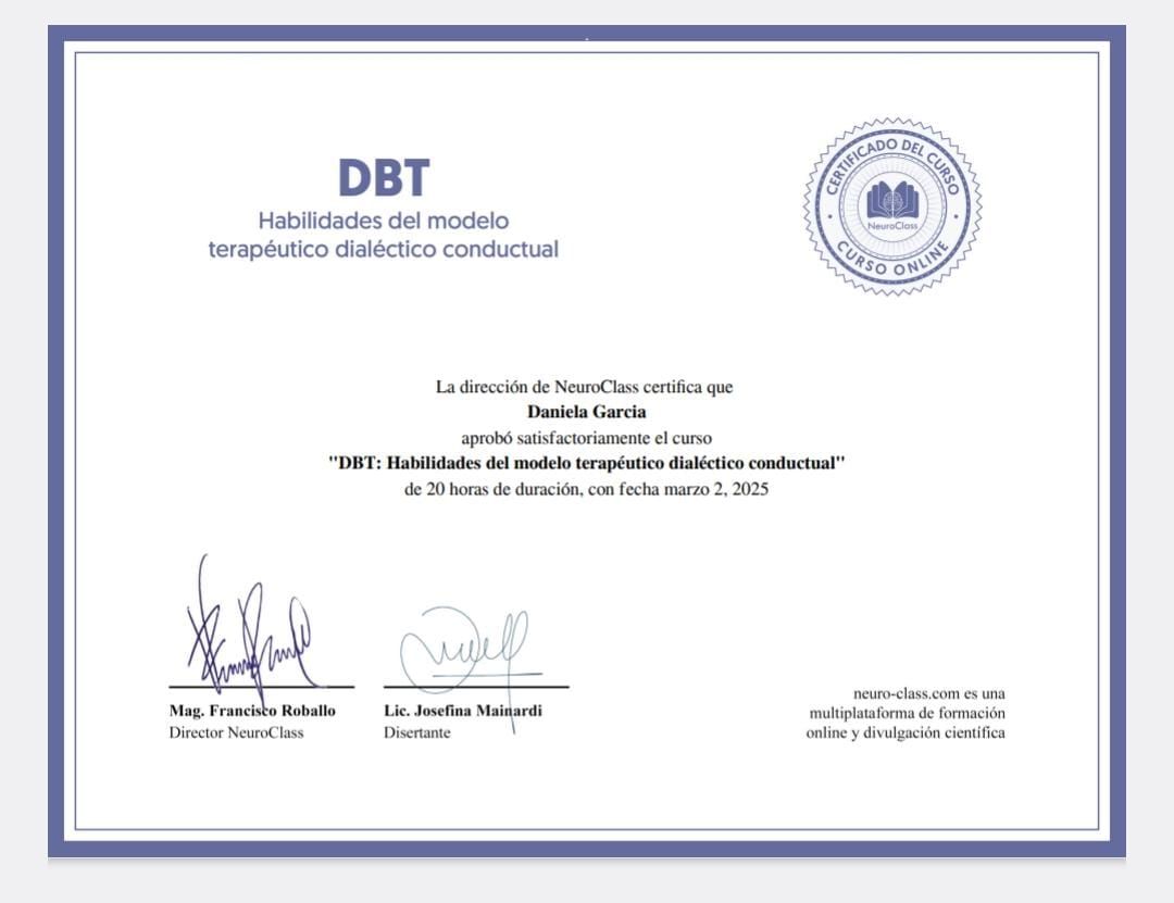 Daniela me hizo sentir escuchada, y me brindó muchísima confianza. Es mi primera vez asistiendo a terapia y estoy muy agradecida y contenta. Siento seguridad y tranquilidad en cada sesión y me está ayudando bastante.