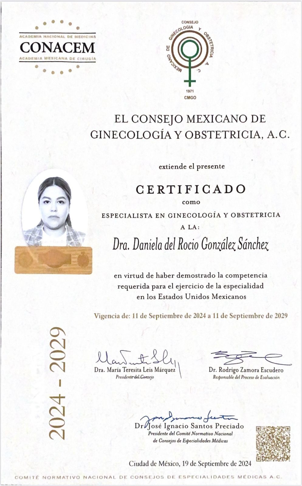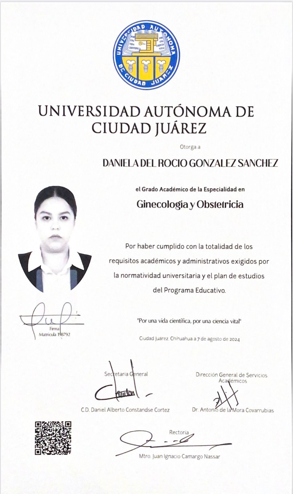 Especialista en Ginecología y Obstetricia, egresada de la Universidad Autónoma de Ciudad Juárez, certificada y avalada por el Consejo Mexicano de Ginecología y Obstetricia.