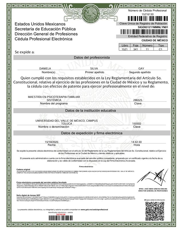 Cuento con maestría en Psicoterapia Familiar Sistémica y una sólida experiencia en consulta privada, intervención individual, con parejas y familias, así como en el diseño de programas de bienestar en contextos educativos.