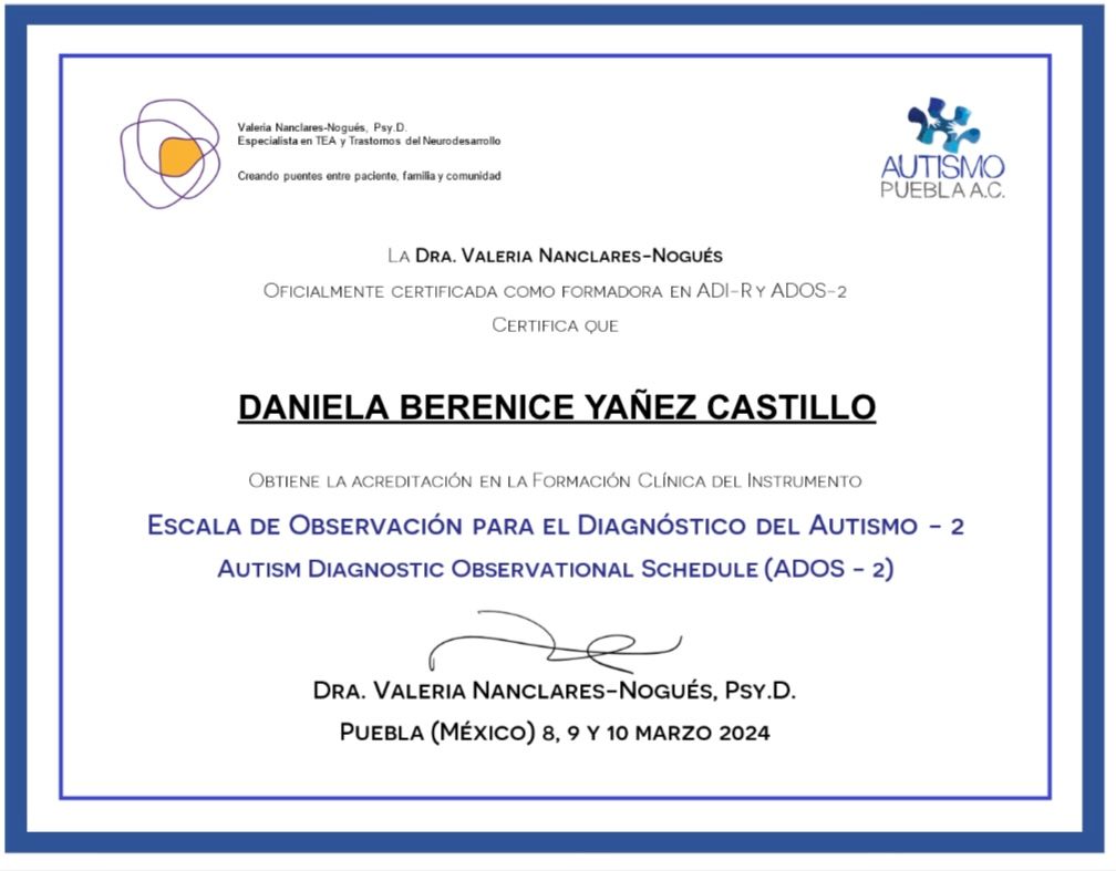 Tengo formación formal en la aplicación del ADOS-2 para la evaluación del autismo, actualizaciones continuas en investigación sobre neurodiversidad y una sólida comprensión de cómo los factores neurobiológicos influyen en el funcionamiento diario.