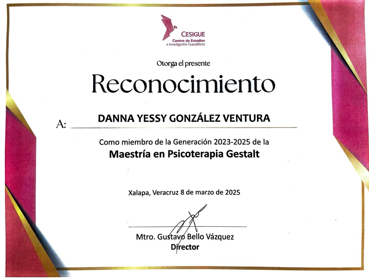 Con la firme intensión de adquirir más herramientas, inicié la Maestría en Psicoterapia Gestalt, lo que además de significar un crecimiento en la dimensión académica, involucró un proceso profundamente personal. Mi vocación por impulsar el crecimiento humano, me lleva a la capacitación constante, pero mas allá de lo intelectual, pongo al servicio de cada consultante mi acompañamiento presente, con la sensibilidad y humanidad necesaria para transitar procesos de transformación personal.