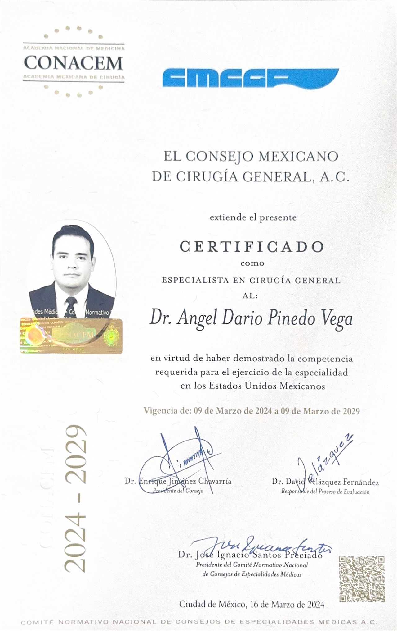 Soy socio activo de la Asociación Mexicana de Cirugía General, Certificado por el Consejo Mexicano de Cirugía General , lo que me permite estar en contacto con los mayores referentes de mi especialidad y aplicar las mejores prácticas en mis tratamientos.