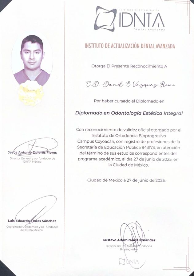 Soy un dentista comprometido con ofrecer una atención clara, honesta y de alta calidad, especialmente en tratamientos estéticos y restaurativos. Trabajo junto con un equipo capacitado que comparte mis mismos estándares. Mi equipo y yo estamos listos para atenderte, siempre asegurando la misma calidad y cuidado en cada consulta.