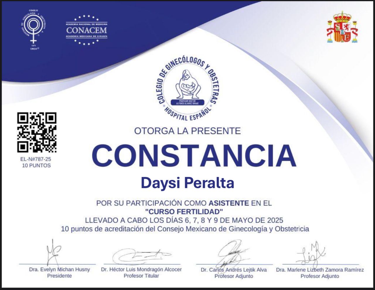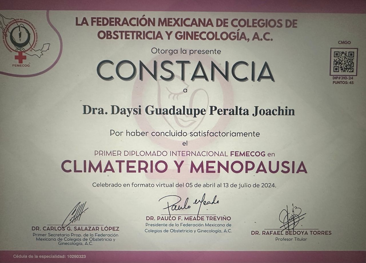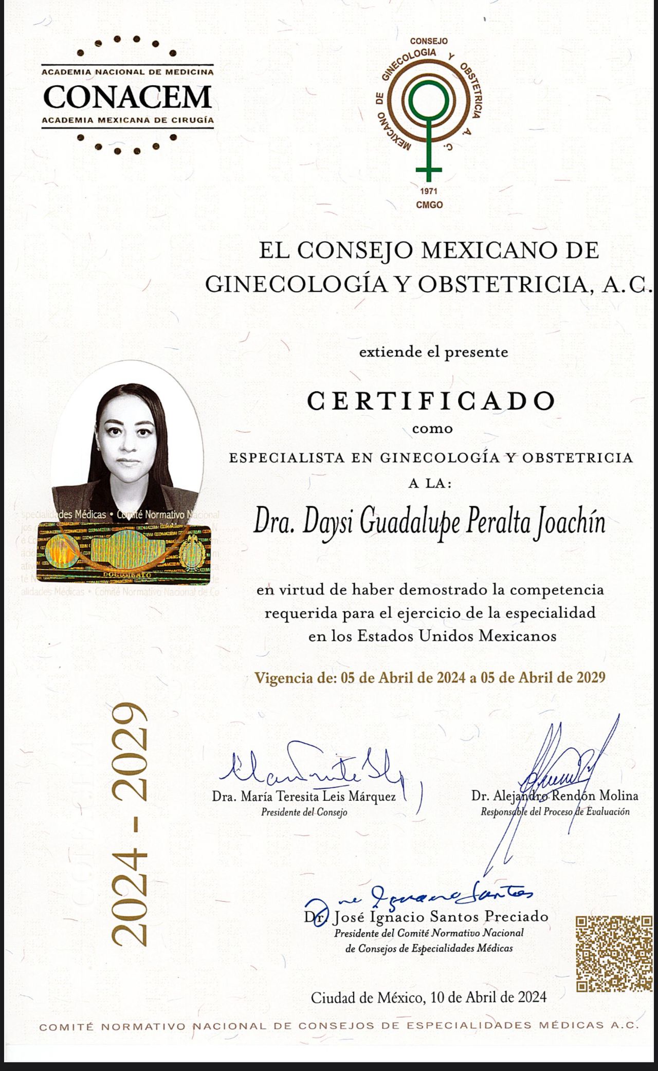 Soy medico cirujano egresada de la Benemérita Universidad Autónoma de Puebla, con Especialidad en Ginecologia y Obstetricia en la Secretaria de Salud de la ciudad de México y avalada por la Universidad Nacional Autónoma de México , certificada por el Consejo Mexicano de Ginecologia y Obstetricia ,así mismo cuento con diplomados y cursos enfocados en mejorar la calidad y atención a mis pacientes tales como : Diplomado en colposcopia diagnostica y terapéutica en Fundación Cruz Talonia y avalado por la Universidad Nacional Autónoma de México . Diplomado en ecografia en Ginecologia y Obstetricia avalado por la Universidad La Salle México y Colegio Nacional de Médicos Militares . Curso de actualizacion continua Soporte Vital Avanzado en obstetricia ALSO . Atención clínica en salud reproductiva y atención del aborto seguro IPAS México y Atención de Modelo de Parteria profesional y parto Humanizado .Diplomado internacional FEMECOG climaterio y menopausia.Diplomado de laser medico quirúrgico en patología del tracto genital inferior y ginecología estética funcional y regenerativa.