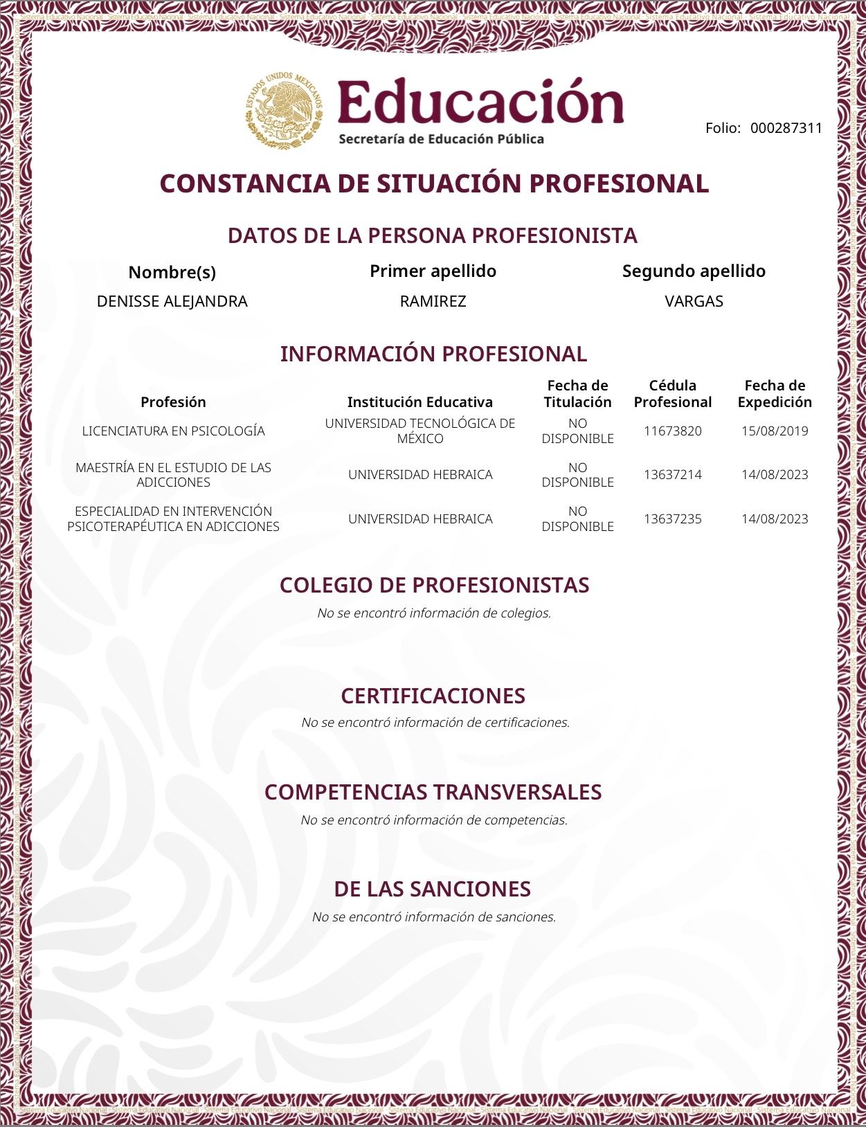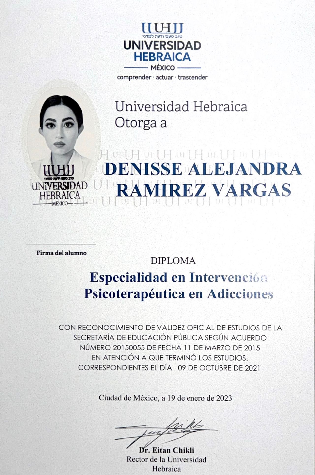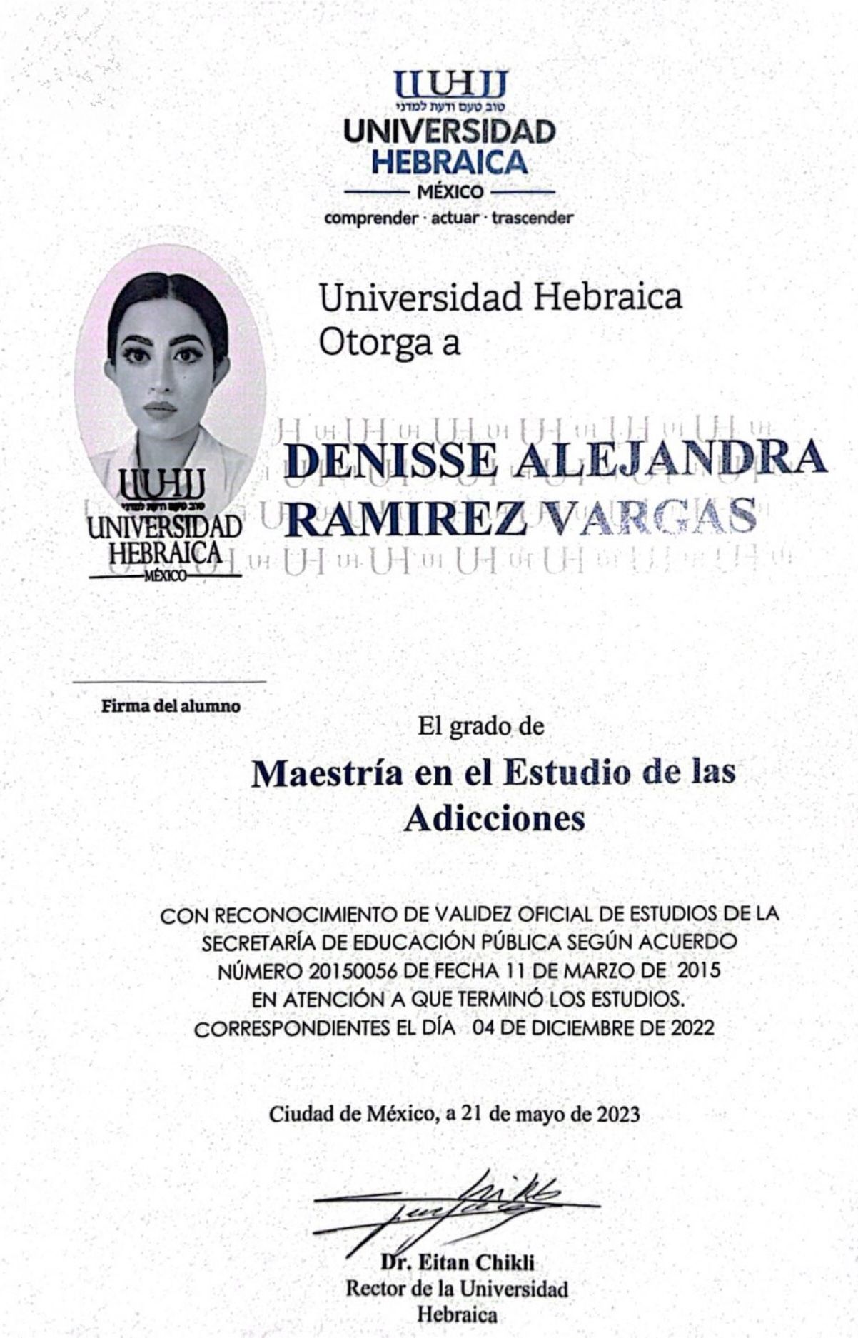 Soy una psicóloga graduada de la Universidad Tecnológica de México. Tengo una especialidad en intervención psicoterapéutica en adicciones y una Maestría en estudio de las adicciones, Realizadas en la Universidad Hebraica, Mexico y actualmente soy Doctorante en psicoanálisis por la Universidad Intercontinental.