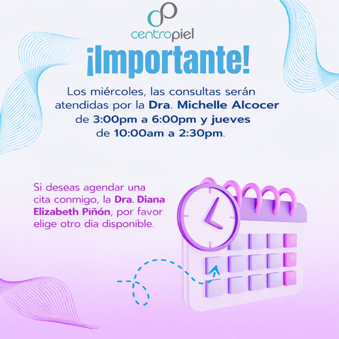 Recuerda que si agendas en día Jueves y Martes de 3:00 pm a 6:00 pm en el consultorio de Sta. Margarita te estará atendiendo la Dra. Michel Alcocer agenda ahora y cuida tu piel.
