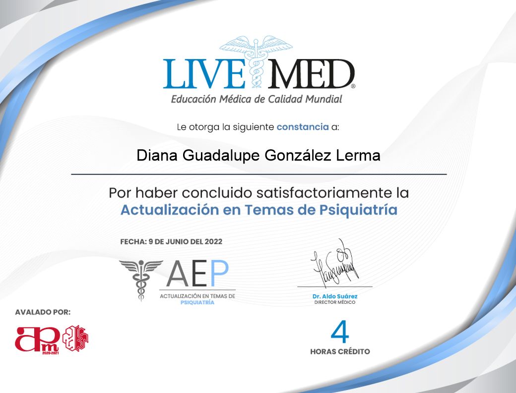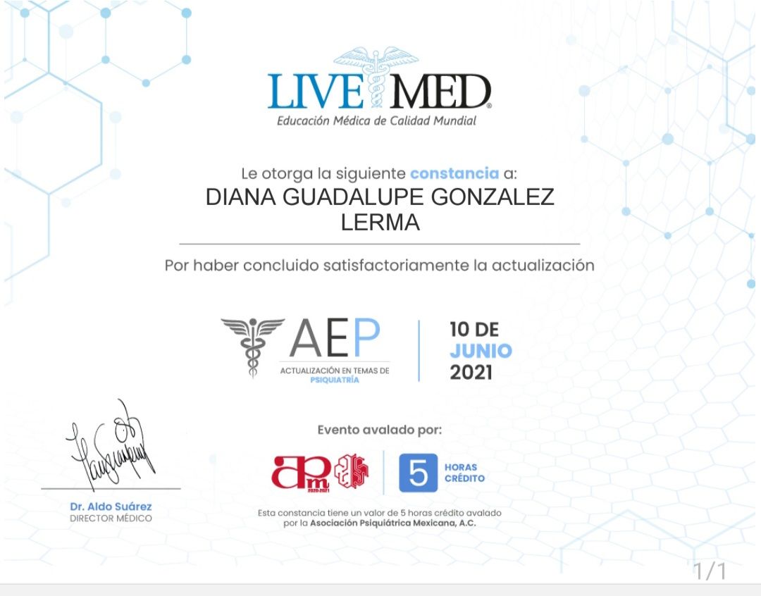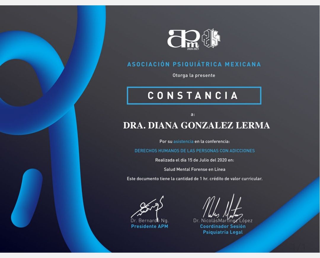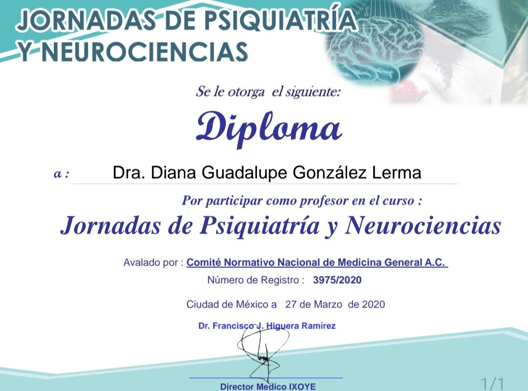 Me presento, soy la Dra. Diana Gonzalez Lerma; Médico cirujano por Universidad Autónoma de Sinaloa; estudie la especialidad en psiquiatría en Hospital Regional de Alta Especialidad en Salud Mental, en Tabasco, con el aval de la UJAT. Posteriormente ingresé a la alta especialidad en "Psiquiatría Legal y Forense", por la Universidad Nacional Autónoma de México, en conjunto con Hospital Psiquiátrico Fray Bernardino. En la preparacion academica, realice un diplomado en TELEMEDICINA, avalado por la asociación psiquiátrica mexicana, por lo que la atención en línea es un método seguro. Certificacion en estimulacion magnetica transcraneal.