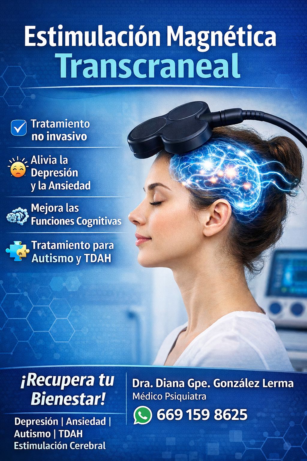 152 opiniones¿BUSCAS UNA ALTERNATIVA DE TRATAMIENTO QUE NO INCLUYA MEDICAMENTOS? CONTAMOS CON EL SERVICIO DE ESTIMULACION MAGNETICA TRANSCRANEAL, UNICO EN MAZATLAN Y APROBADO POR FDA DESDE EL AÑO 2008, PARA TRATAR DIVERSOS PADECIMIENTO NEUROLOGICOS Y PSIQUIATRICOS.