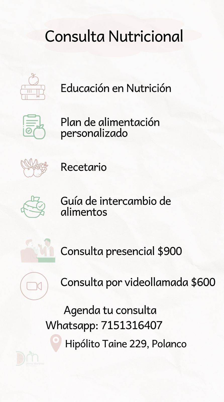 Fue mi primera cita y Diana fue muy profesional, tiene alto conocimiento en nutrición, dedico el tiempo a escuchar mis objetivos y esclarecer mis dudas. Me hizo sentir en confianza
