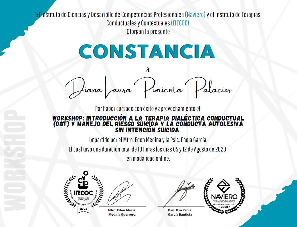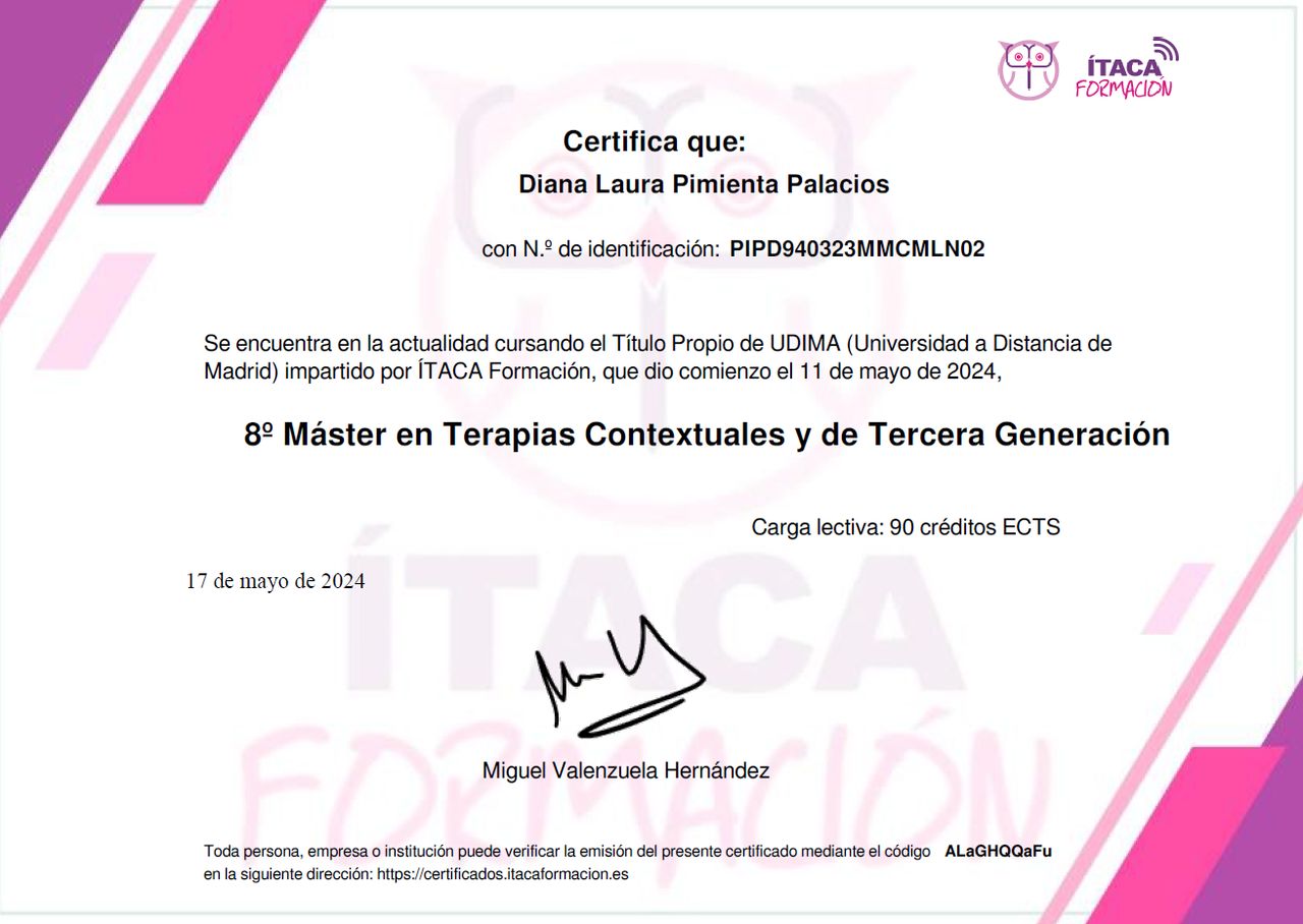 Actualmente estoy especializada en psicología clínica, cuento con Máster en terapias contextuales y de tercera generación cursado en La Universidad a Distancia de Madrid (UDIMA), Terapia Dialectico Conductual para trastornos de personalidad, del estado del animo, evaluaciones psicométricas en adolescentes y adultos.
