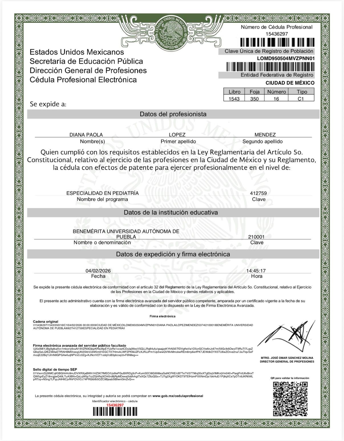 Pediatra certificada por el Consejo Mexicano de Pediatría no. 27645