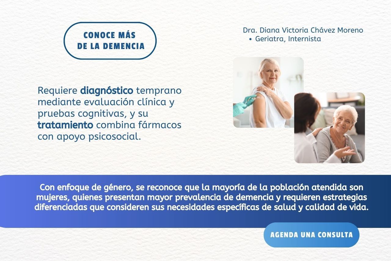 Soy la Dra. Diana Victoria Chávez Moreno, especialista en Geriatría y Medicina Interna, egresada de la Universidad Nacional Autónoma de México, una de las instituciones más importantes en la formación de especialistas en atención integral del adulto mayor. Cuento con Diplomado en Demencias por el Instituto Nacional de Ciencias Médicas y Nutrición Salvador Zubirán y formación en Atención Centrada en la Persona con Demencia por el Instituto Nacional de Geriatría.