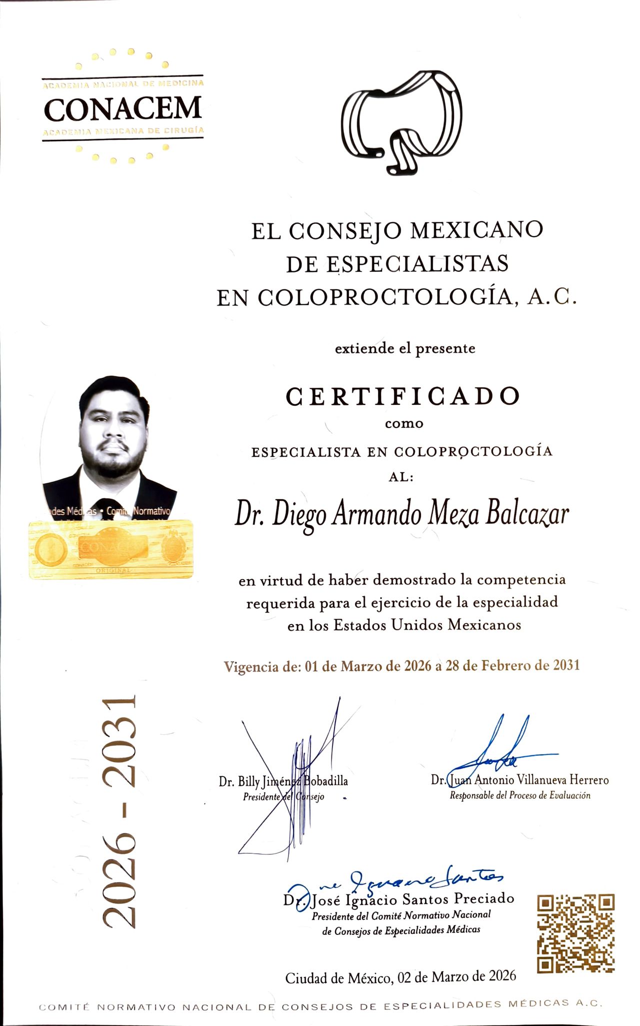 - Certificado por el Consejo Mexicano de Especialistas en Coloproctología desde el 2026