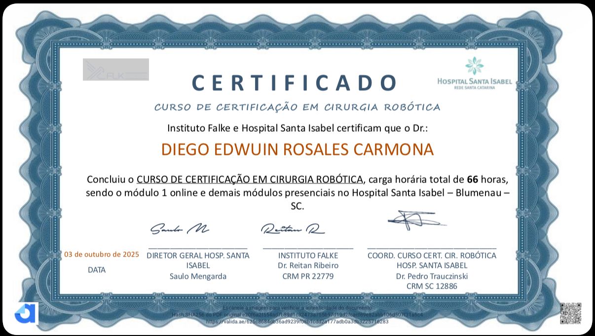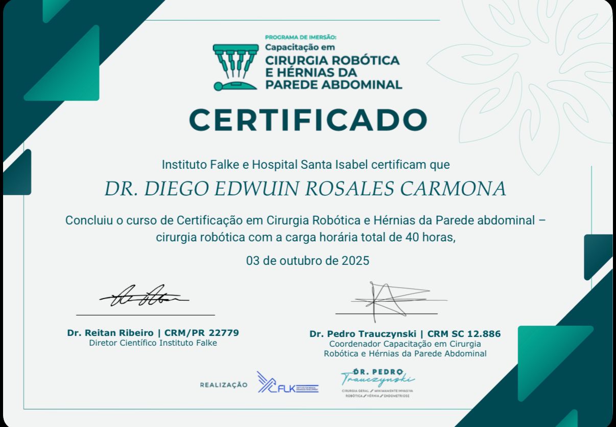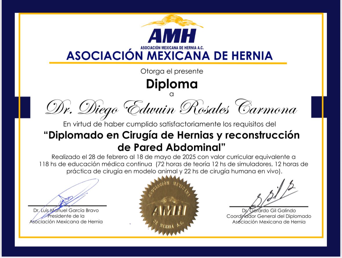 Cirujano Gastrointestinal con CERTIFIACIÓN EN CIRUGÍA ROBÓTICA por SCOLLA-FKS Brasil, adiestramiento en Cirugía laparoscópica avanzada, Cirugia SIN HUELLA guiada con Imanes, Cirugía de Hernia, reconstrucción de pared abdominal y prehabilitación para Hernia Compleja por la Asociación Mexicana de Hernia, Certificación en HERNIAS DE PARED ABDOMINAL, Cirugía de Trauma avalado por la Asociación Panamericana de Trauma Miembro de la Asociación Mexicana de Cirugía, Miembro de la Asociación de Cirugía Endoscópica, Miembro de la Asociación Mexicana de Hernia, Miembro del Colegio Americano de Cirujanos Cirujano certificado