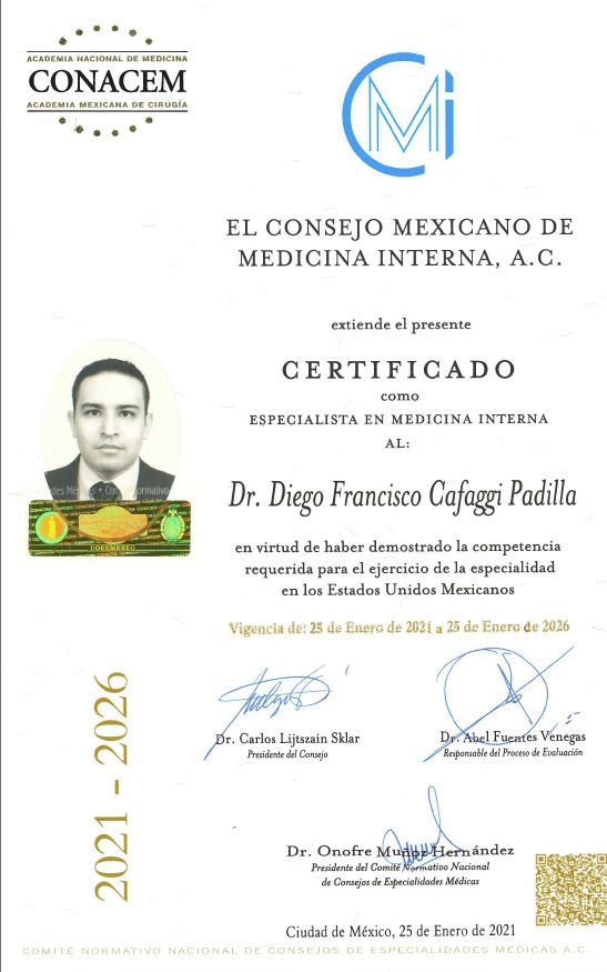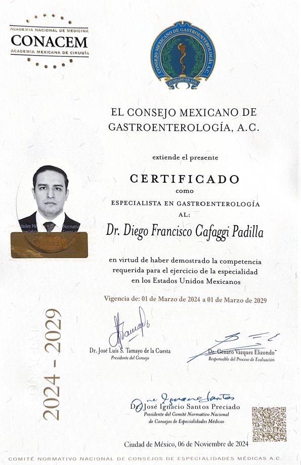 Soy el Dr. Diego Cafaggi, médico por la UNAM, con formación en Medicina Interna y especialidad en Gastroenterología realizada en el Hospital 20 de Noviembre del ISSSTE. Estoy certificado por el Consejo Mexicano de Medicina Interna y el Consejo Mexicano de Gastroenterología, lo que respalda una práctica actualizada y basada en los más altos estándares de calidad. Gracias a la combinación de ambas áreas, cuento con una visión integral que me permite abordar de manera completa la prevención, diagnóstico y tratamiento de las enfermedades del aparato digestivo.