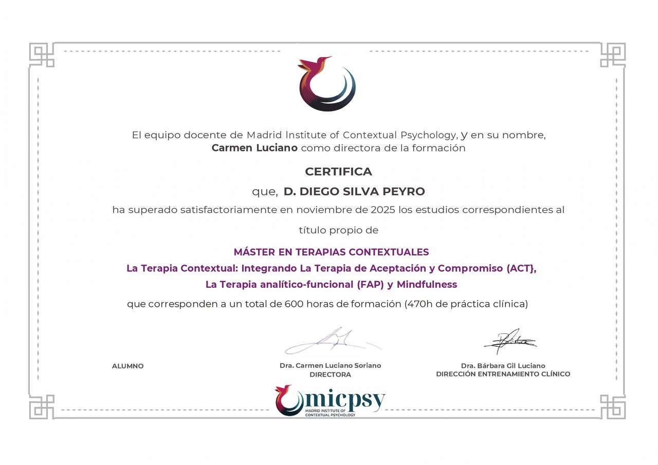 Llegué con Diego en un momento complicado y la verdad me sentí muy entendido desde la primera sesión. Es alguien que escucha con atención y hace preguntas que realmente te ayudan a entender lo que estás viviendo. Me ha servido mucho el proceso. Lo recomiendo