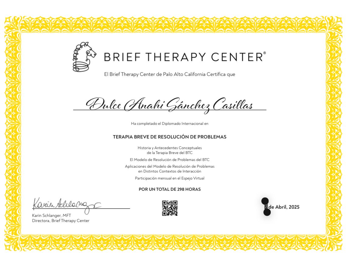 Cuento con diplomados en Terapia Breve Centrada en Soluciones por la Universidad de Palo Alto y en el uso de las artes expresivas en psicoterapia, herramientas que integro en mi práctica según las necesidades de cada persona o familia.