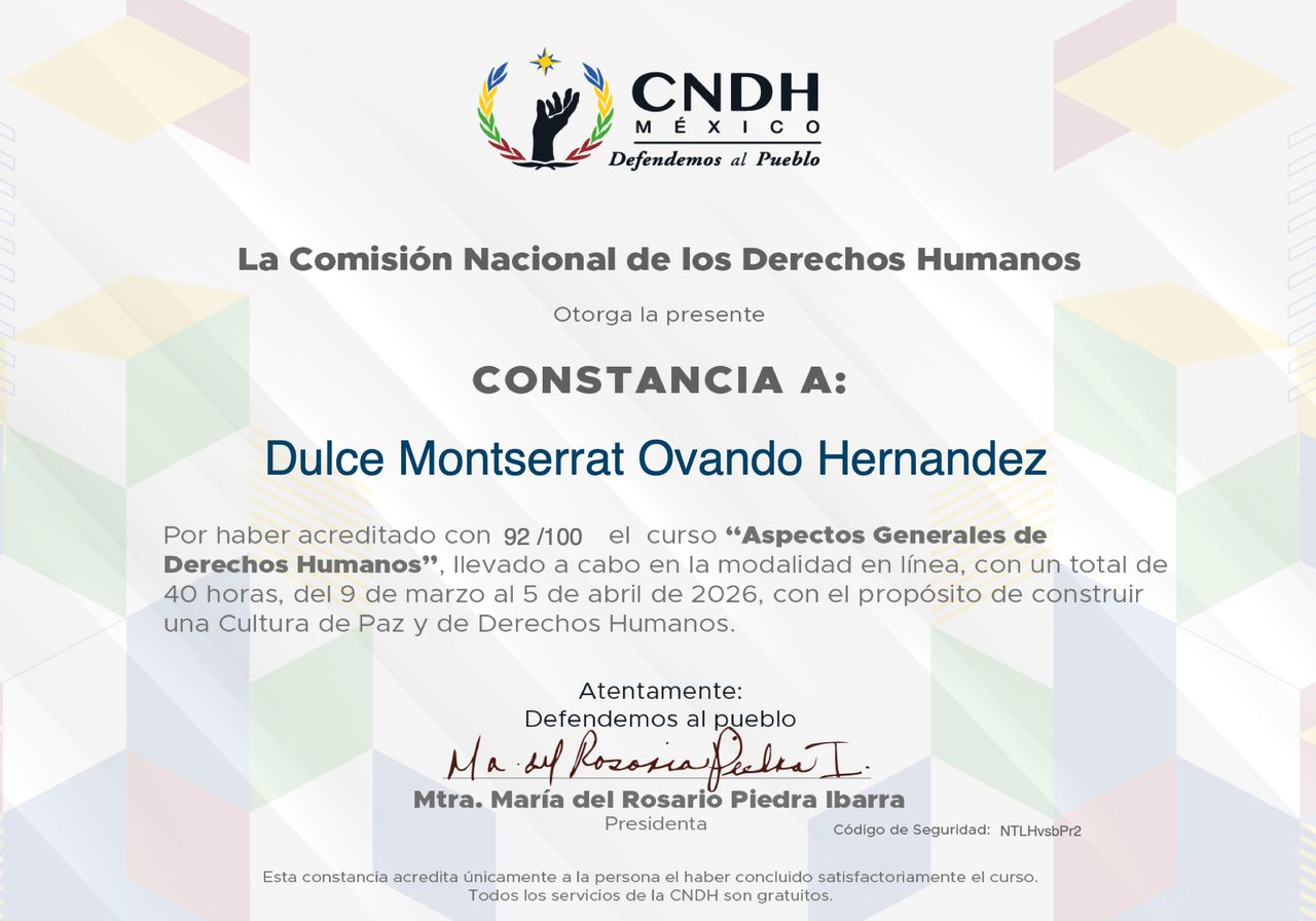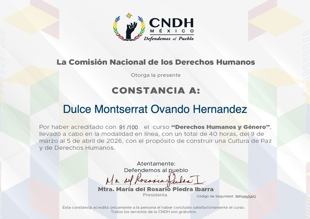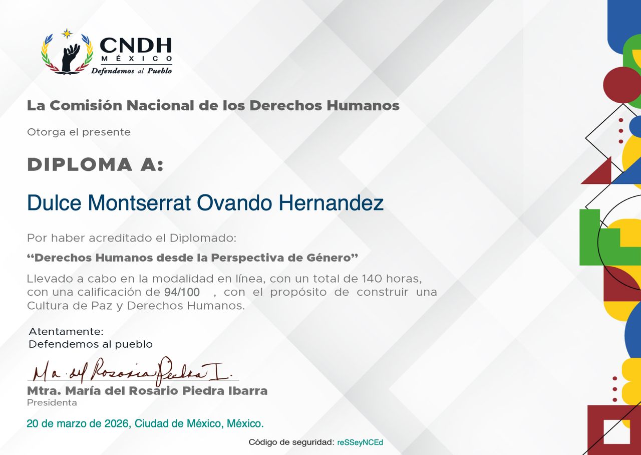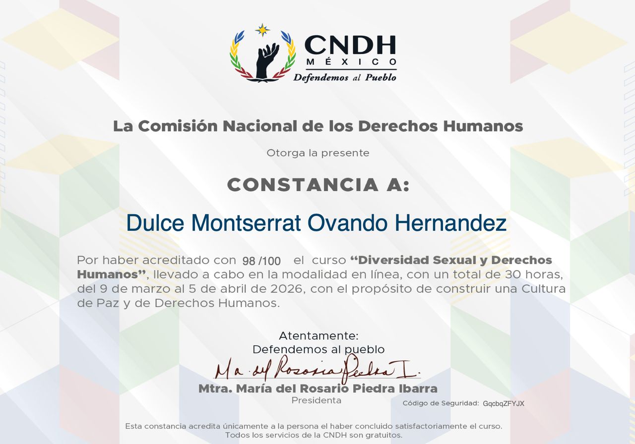Cuento con un diplomado en Derechos Humanos desde la Perspectiva de Género por la CNDH, lo que fortalece mi práctica con un enfoque ético, inclusivo y consciente de la diversidad, asegurando un acompañamiento seguro y respetuoso.