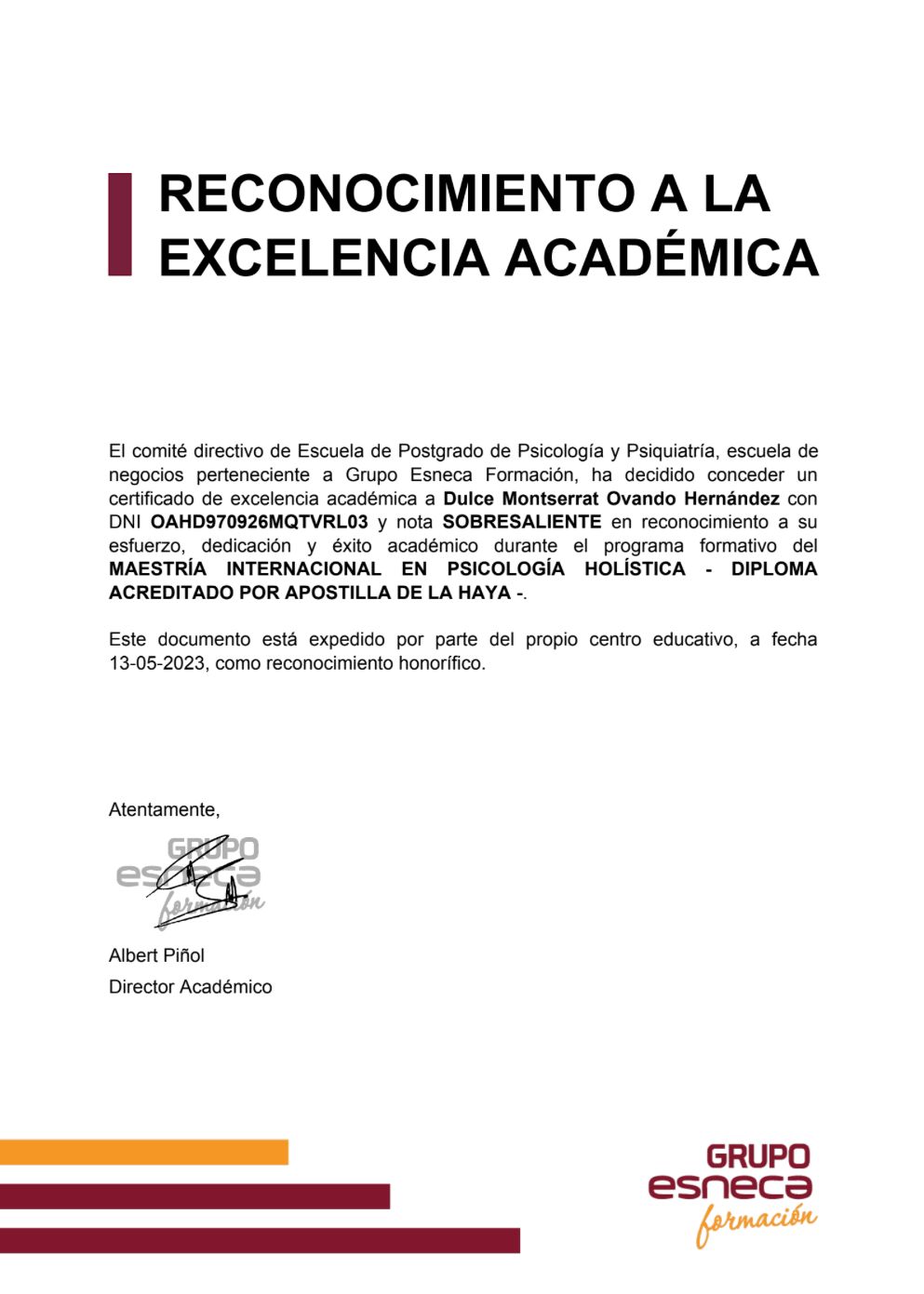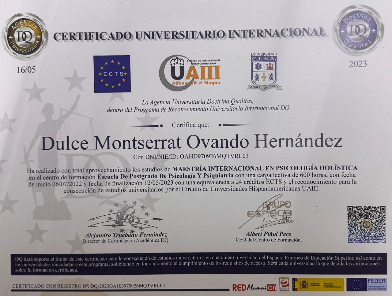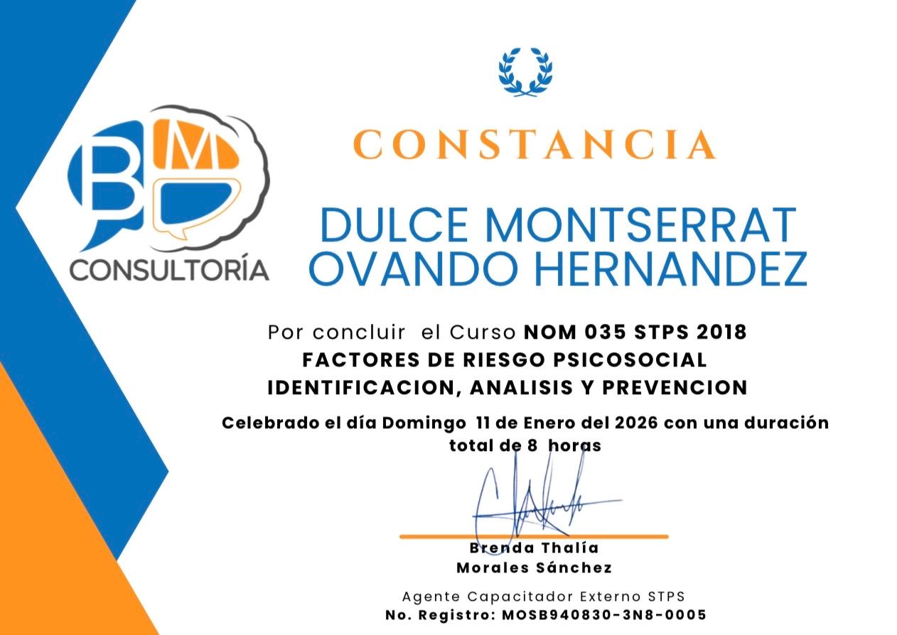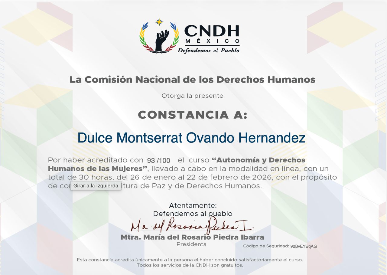 Cuento con un diplomado en Derechos Humanos desde la Perspectiva de Género por la CNDH, lo que fortalece mi práctica con un enfoque ético, inclusivo y consciente de la diversidad, asegurando un acompañamiento seguro y respetuoso.
