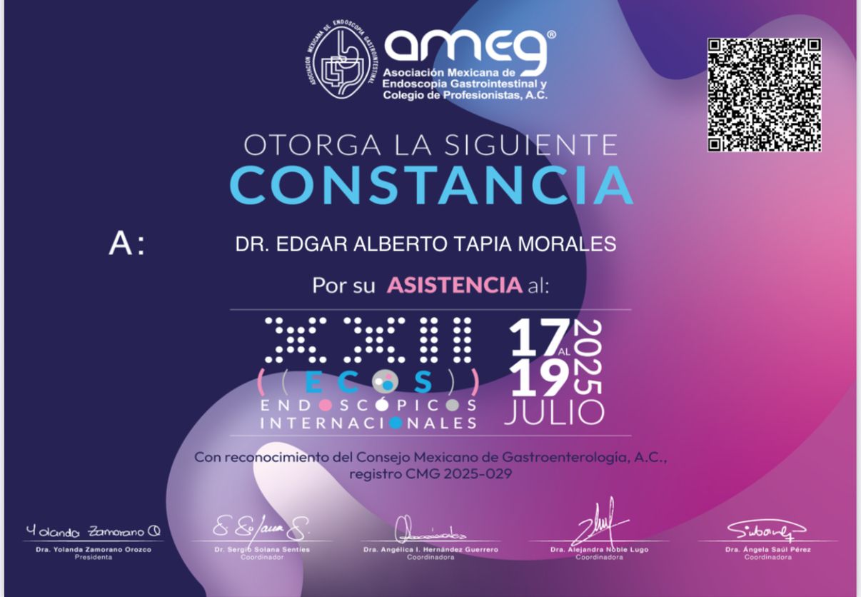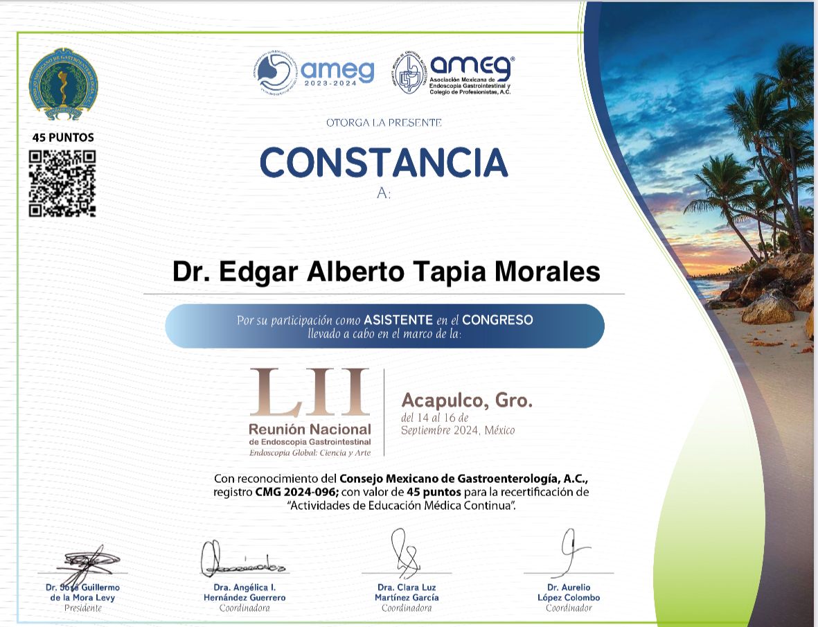 Soy el Dr. Edgar Alberto Tapia Morales con más de 6 años de experiencia en Endoscopia Gastrointestinal y Cirugía General obteniendo el grado académico en la Universidad Nacional Autónoma de México (UNAM). Además, graduado como Cirujano General en la Benemérita Universidad Autónoma de Puebla (BUAP). Experto en Cirugía General respaldado por mi certificación otorgada por el Consejo Mexicano de Cirugía General. Enfoque profesional centrado en brindar atención especializada y de calidad en el ámbito de la endoscopia gastrointestinal y la cirugía general. Comprometido con la excelencia reflejada tanto en mi formación académica como en la práctica clínica, donde se busca constantemente ofrecer un trato humanista, empático y amable para mejorar la salud y el bienestar de aquellos a quienes tengo el privilegio de atender.