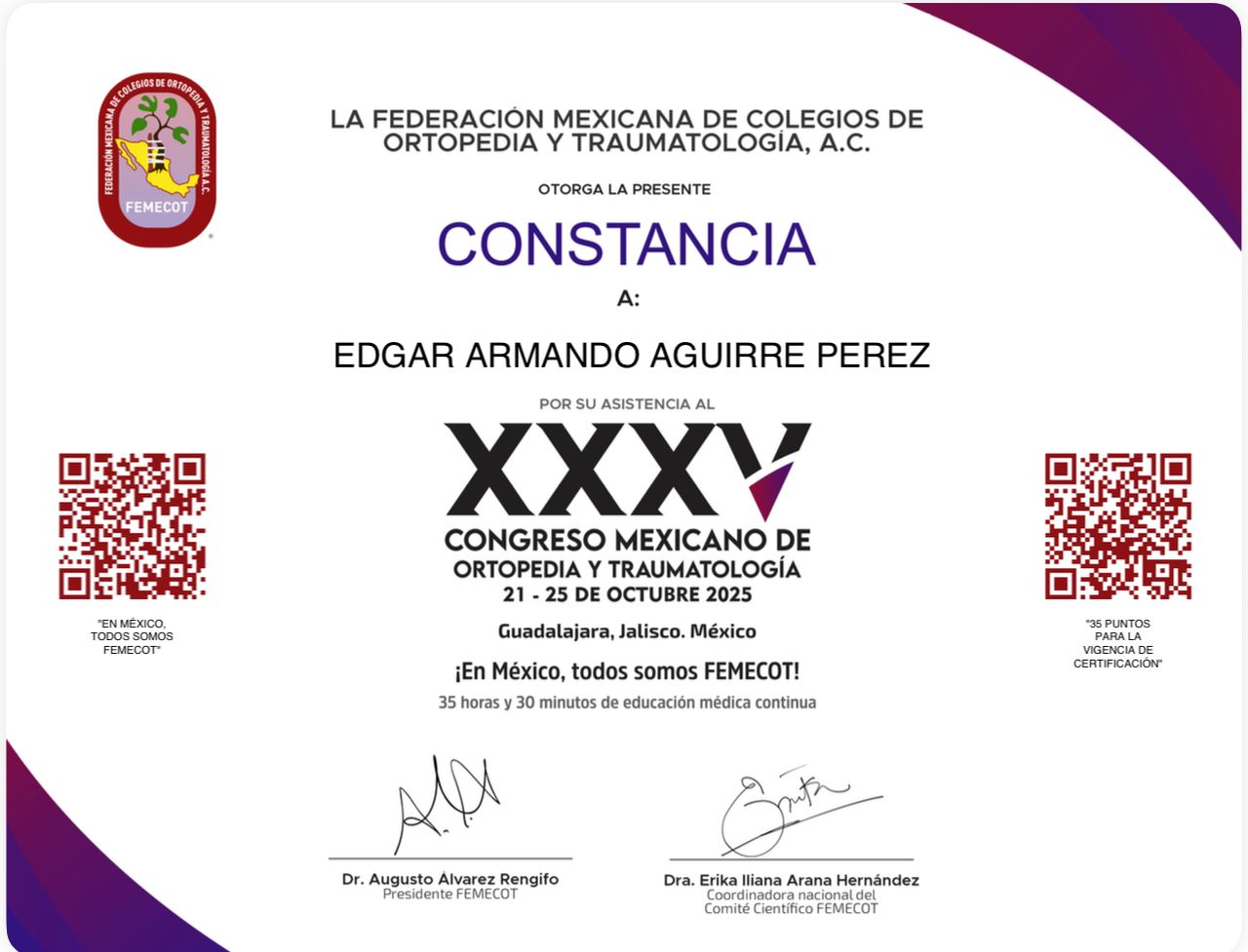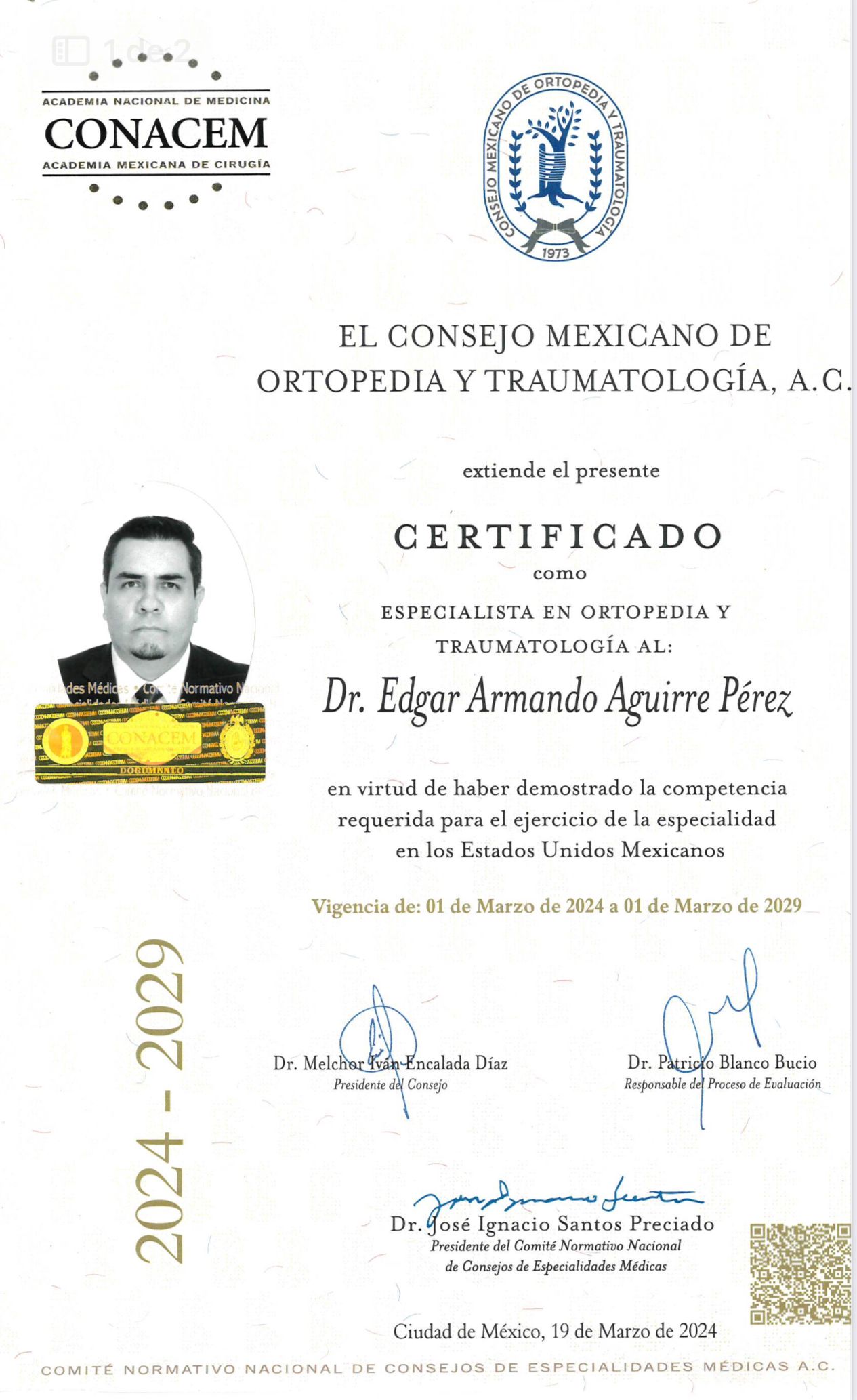 Certificado por el Consejo Mexicano de Ortopedia y Traumatología.