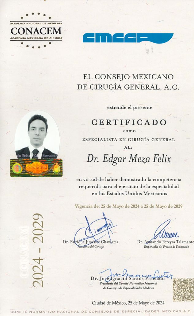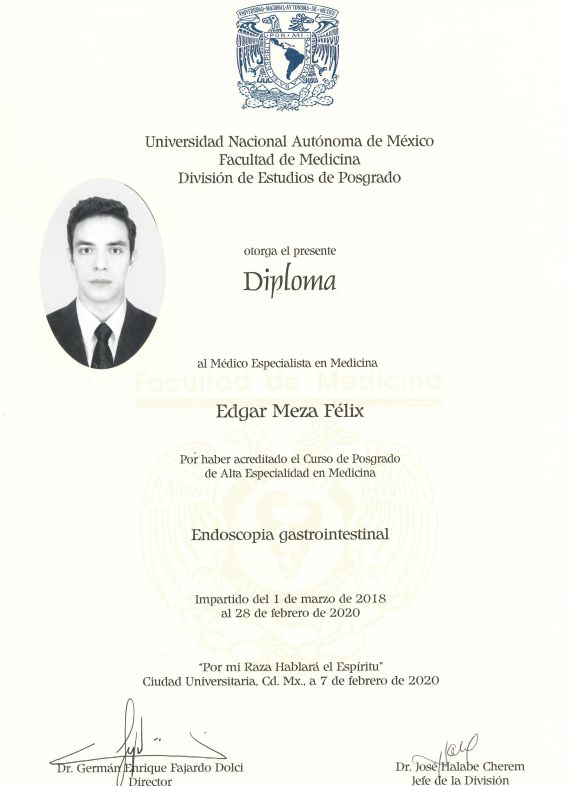 Mi nombre es Edgar Meza Felix, soy egresado de la Universidad Autonoma de Guadalajara (2007 - 2013) Especialista en Cirugia General por la UNAM (2014- 2018) en el Hospital Central de Cruz Roja Mexicana en la Ciudad de México, posteriormente realice Alta Especialidad en Endoscopia Gastrointestinal (UNAM 2018-2020) en el Hospital Fernando Quiroz en la Ciudad de México.