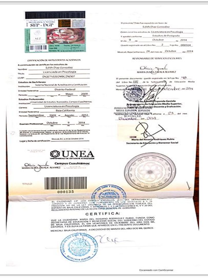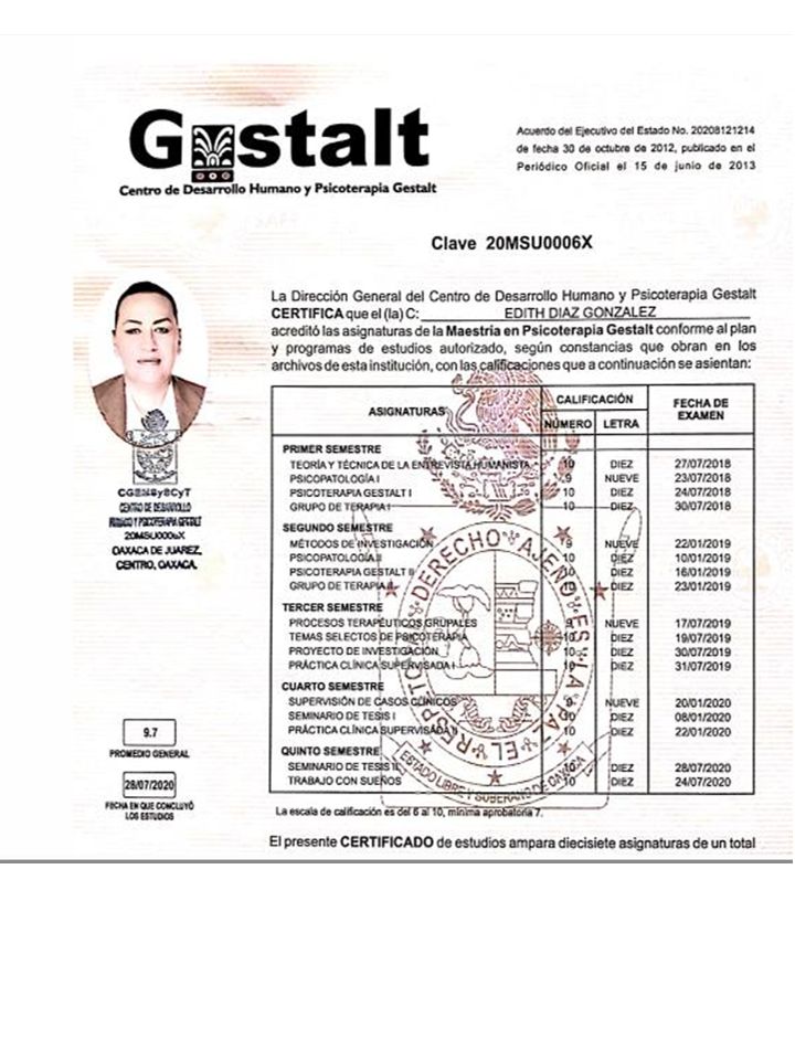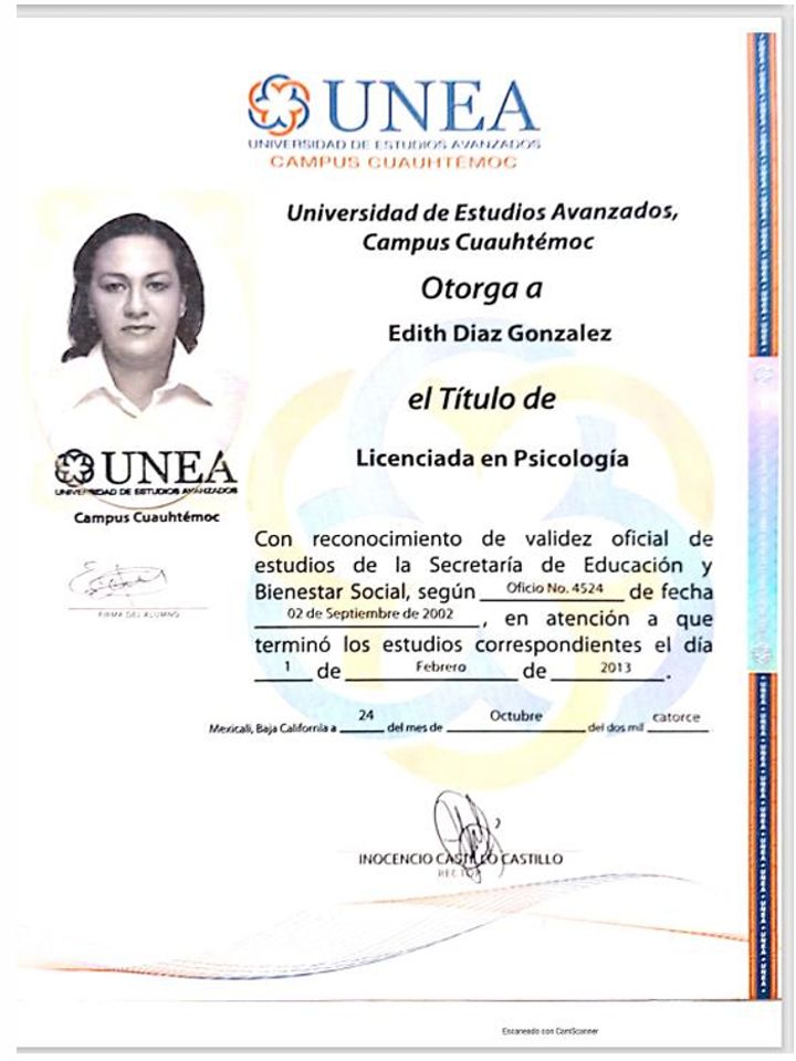 Licenciada en psicología, con especialidad en psicoterapia, en UNEA, Mexicali, B.C., también soy Maestra en Psicoterapia Gestalt, Certificada en Terapia de Regresión y Conciencia Existencial, y actualmente Doctorante en Educación y Desarrollo Integral del Ser por el Centro de Desarrollo Humano y Psicoterapia Gestalt. Atiende consulta particular en Bios-Psique en Mexicali, B.C.