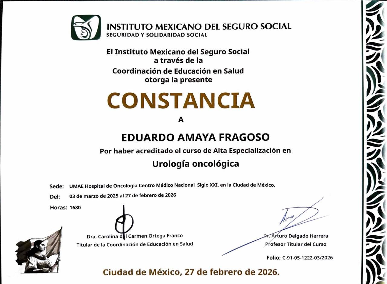 Soy Cirujano Urólogo egresado de la Unidad Médica de Alta Especialidad No. 25 de Monterrey, Nuevo León. Posteriormente me gradué como Urólogo Oncólogo (Alta Especialidad) de la Unidad Médica de Alta Especialidad en Oncología del Centro Médico Nacional Siglo XXI (IMSS). Finalmente, soy Urólogo Robótico (Alta Especialidad) egresado del Instituto Israelita Albert Einstein en São Paulo, Brasil.