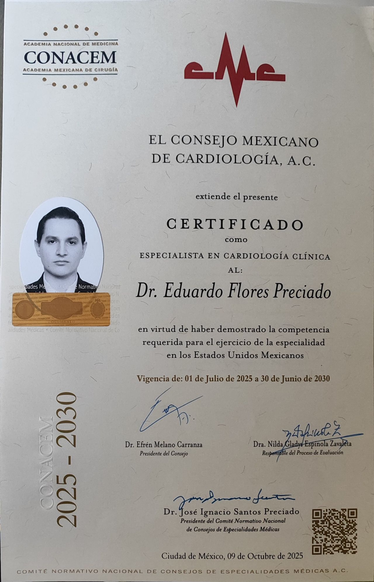El Dr. Eduardo Flores Preciado ofrece una atención excepcional. Explica con claridad, escucha con paciencia y toma decisiones médicas sólidas y bien fundamentadas. Su trato transmite confianza, profesionalismo y un compromiso genuino con el bienestar del paciente. Altamente recomendable para quienes buscan un cardiólogo de primera.