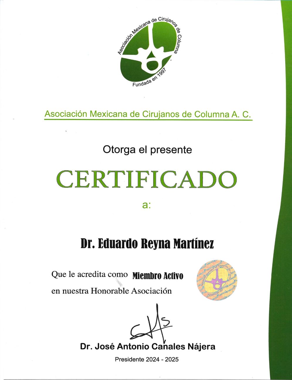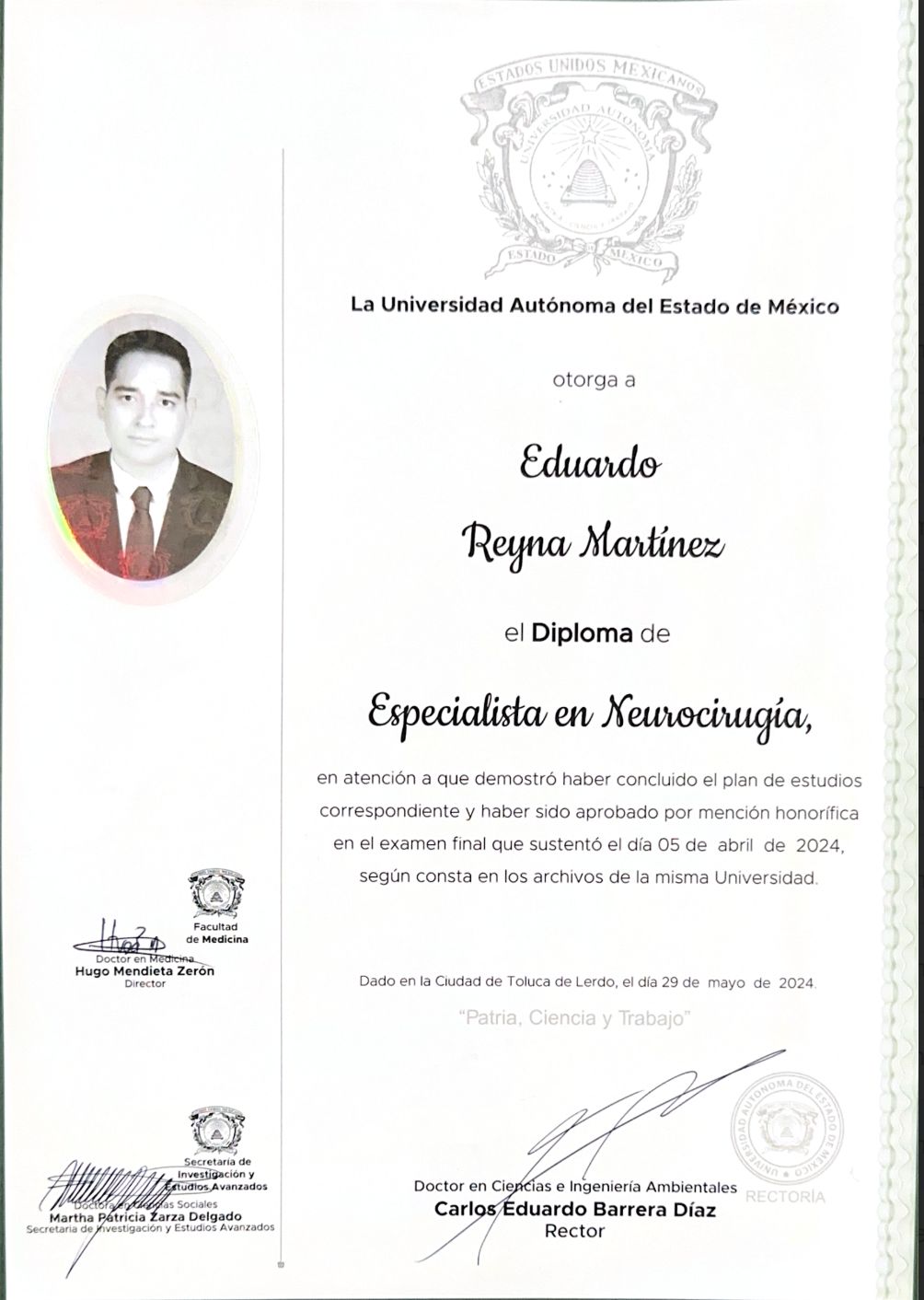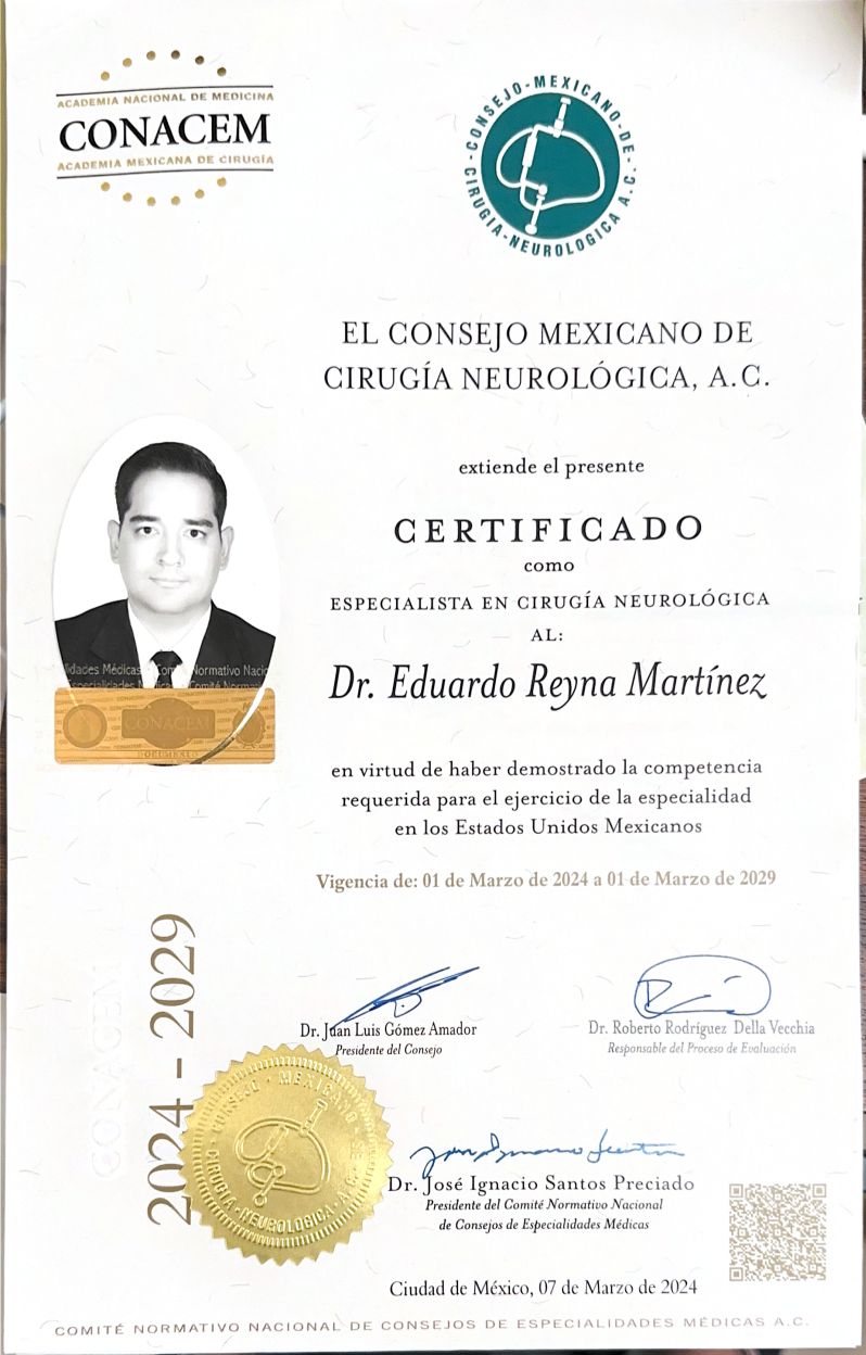 Soy el Dr. Eduardo Reyna, cuento con especialidad en neurocirugía asi como una alta especialidad en cirugia de columna vertebral, me encuentro certificado por el Consejo Mexicano de Cirugía Neurológica. Tengo experiencia en el tratamiento medico y quirúrgico de enfermedades cerebrales y de columna vertebral. Con gusto te atenderé con la finalidad de ofrecerte la mejor opción de tratamiento.