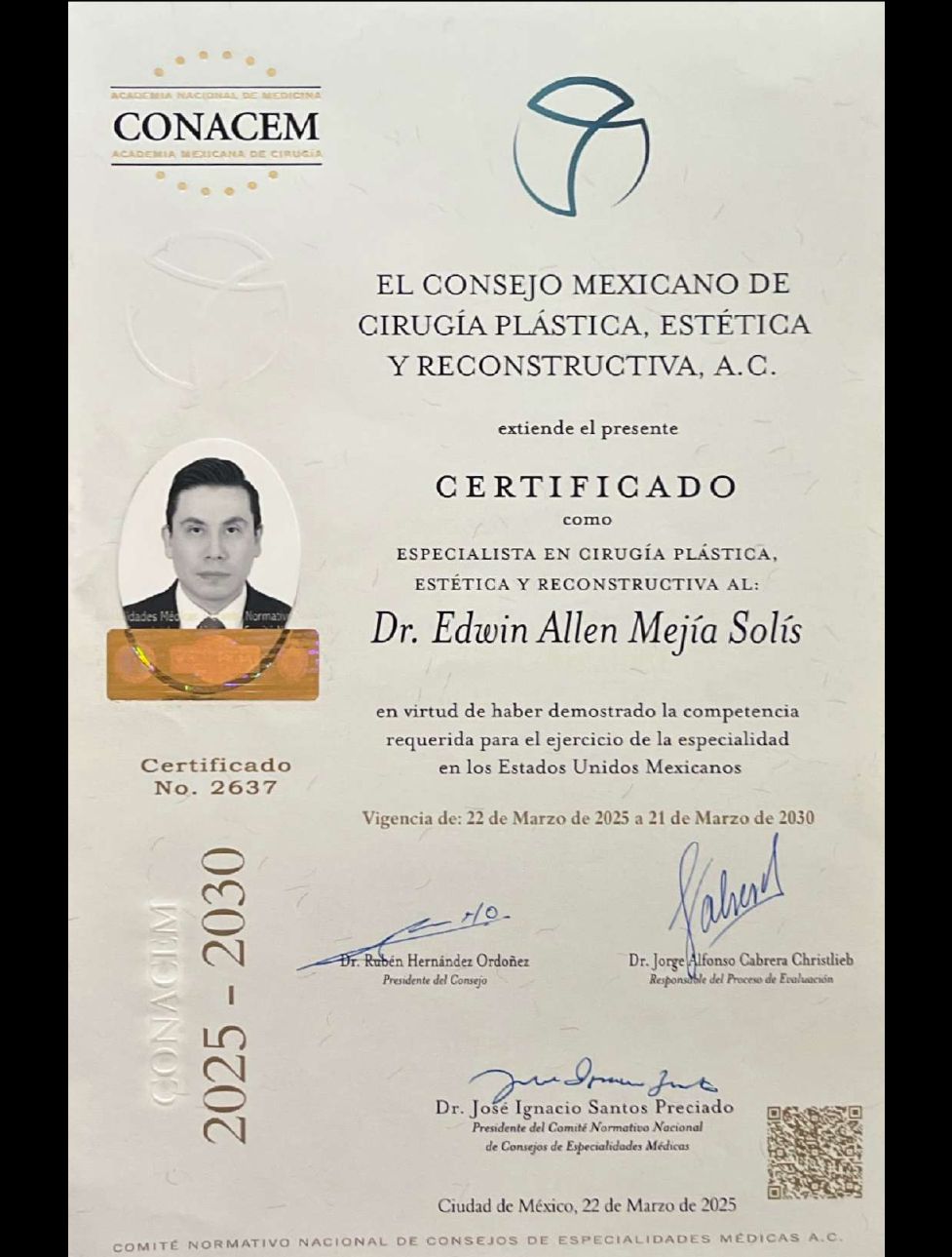 Soy el Dr. Allen Mejía, Cirujano Plástico con Doble Certificación y formación de alta especialidad en Brasil y España. Mi compromiso es ayudarte a sentirte seguro y satisfecho con tu imagen, priorizando siempre la seguridad, la naturalidad y el respeto por cada paciente.