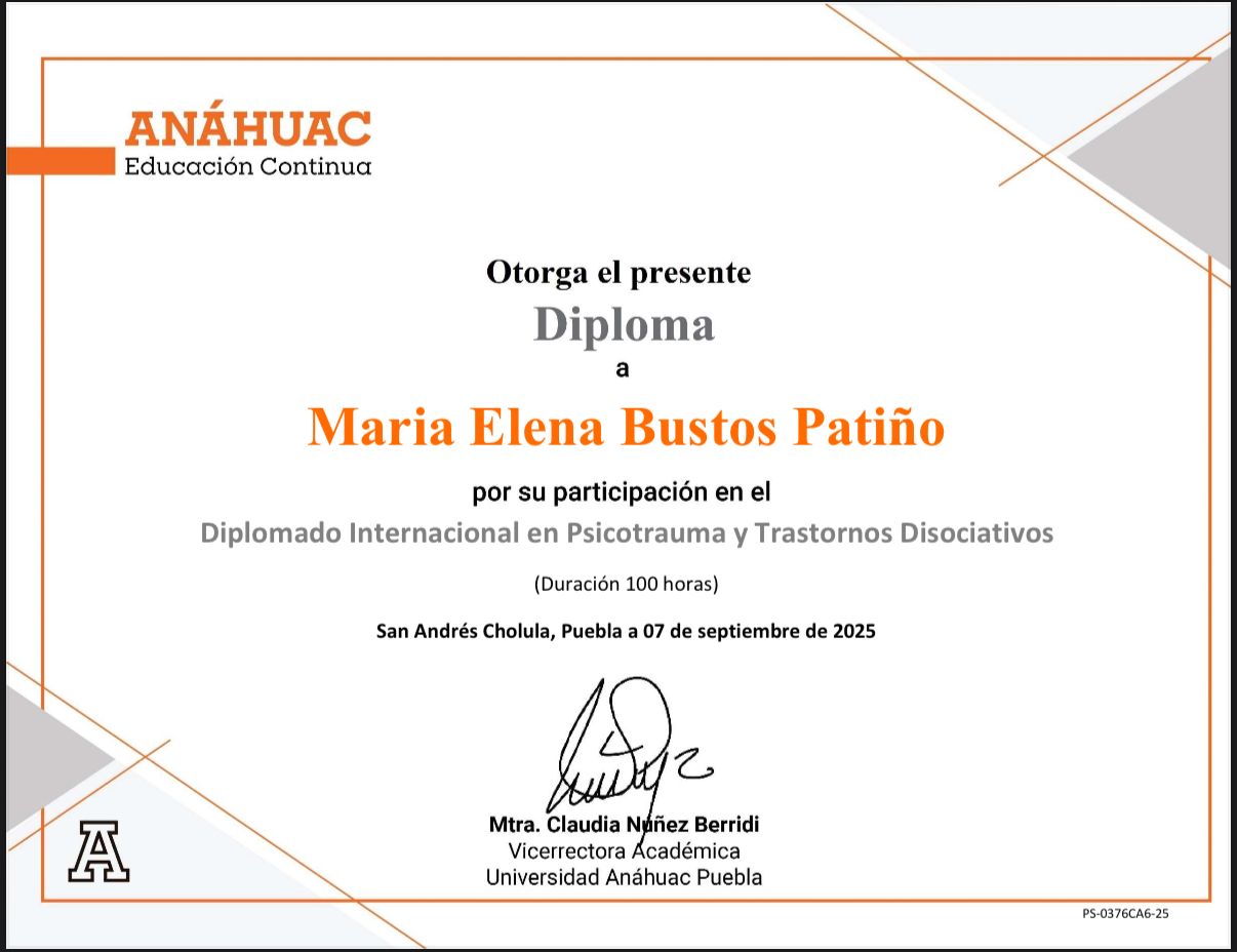 Atención a trauma, ansiedad, depresión y estrés.Formación clínica UVM, CEU, diplomados en Anáhuac.Práctica ética, empática y profesional.