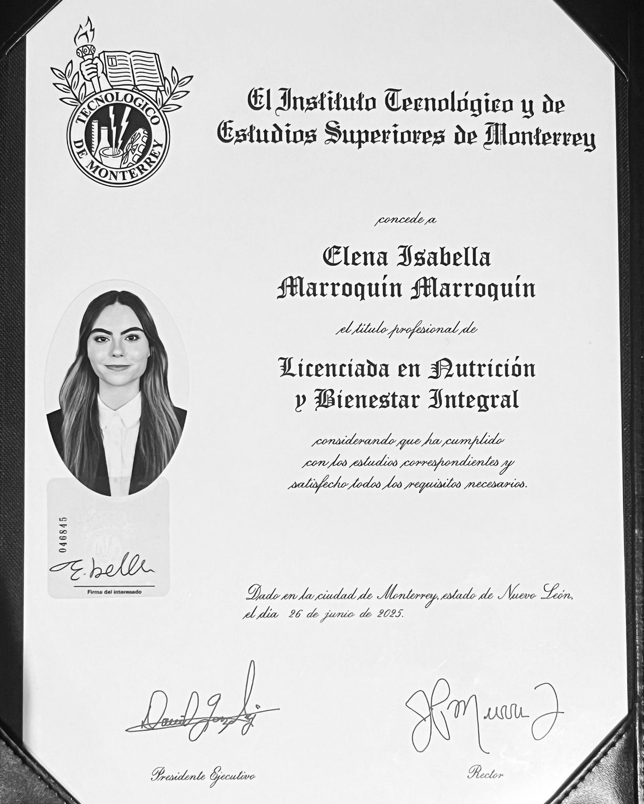 Soy egresada de la Licenciatura en Nutrición y Bienestar Integral del Tecnológico de Monterrey, comprometida con una práctica enfocada en evidencia científica.