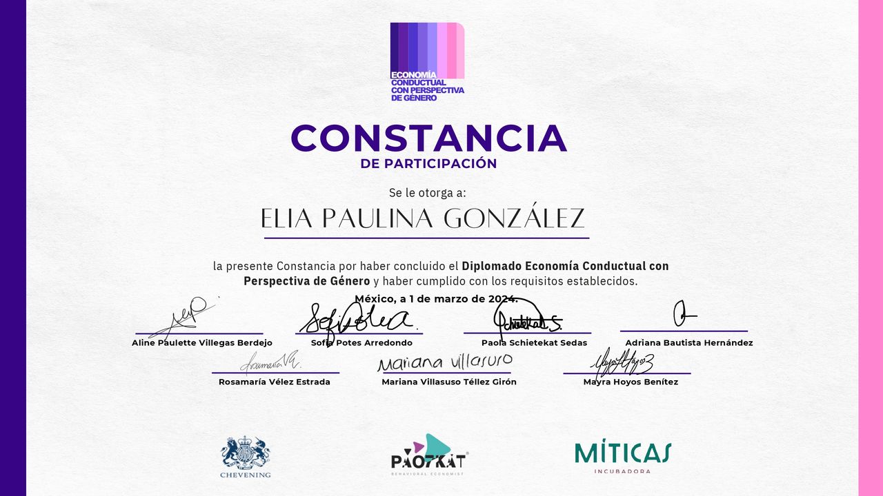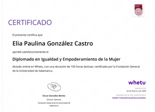 Certificada en Igualdad y Empoderamiento de la Mujer por la Universidad de Salamanca