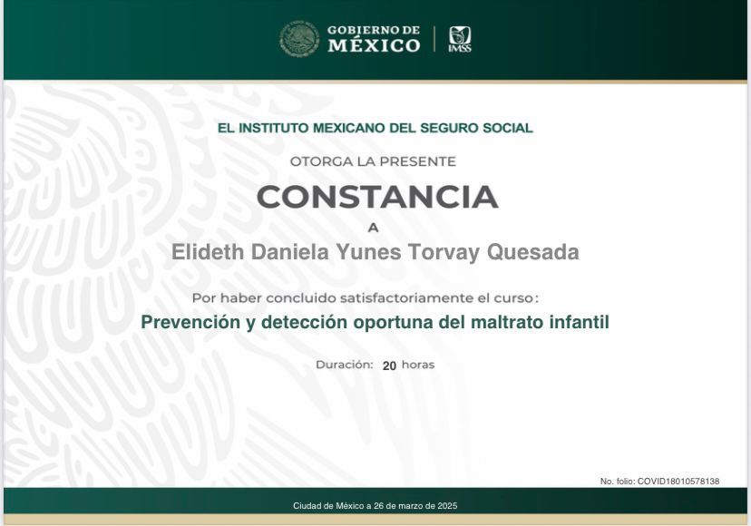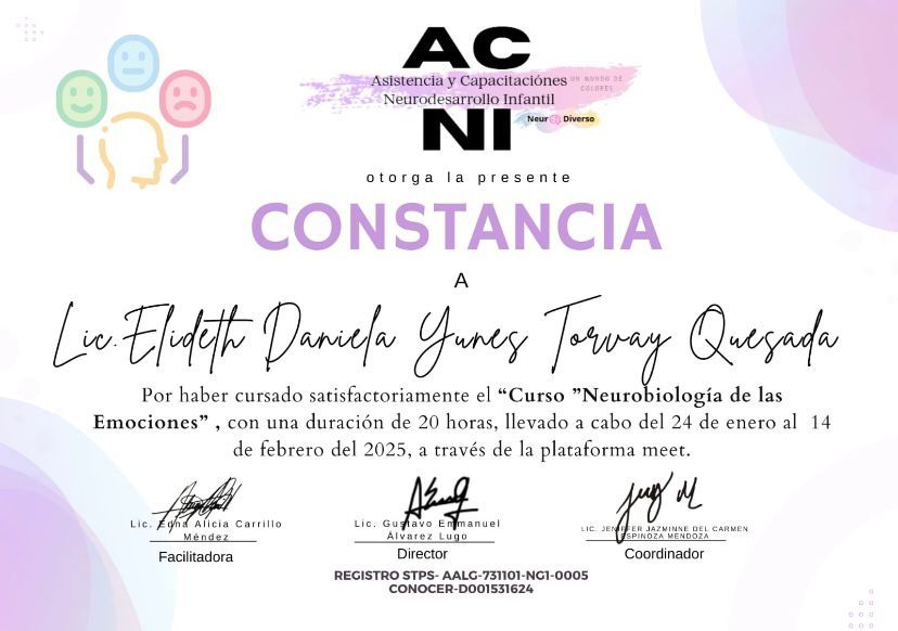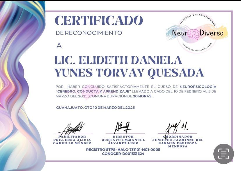 Actualmente curso la Maestría en Neuropsicología, lo que me permite enriquecer mi práctica con una visión más integral del desarrollo infantil.