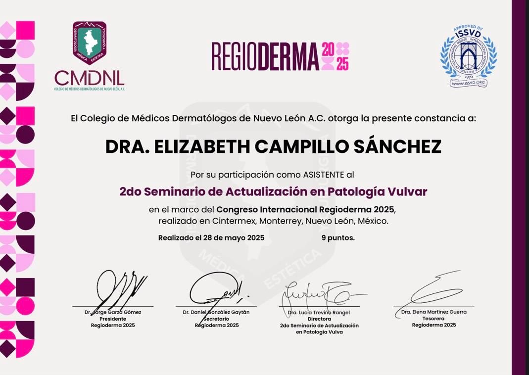 Certificada por el Consejo Mexicano de Dermatología, siempre buscando la actualización médica.