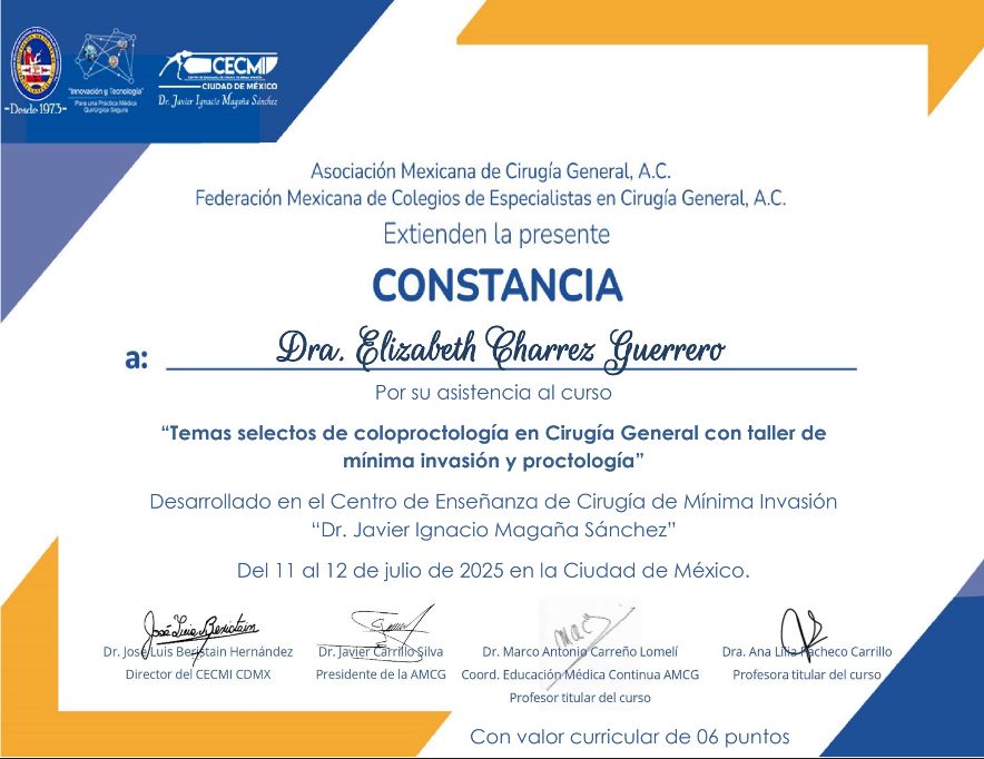 Cirujana General certificada por el Consejo Mexicano de Cirugía General, especialista en cirugía laparoscópica avanzada y tratamiento de hernias complejas. Como miembro de la Asociación Mexicana de Cirugía General y de la Asociación Mexicana de Hernia, brindo atención quirúrgica de vanguardia, segura y completamente personalizada, enfocada en minimizar riesgos, optimizar resultados con la excelencia que merecen mis pacientes.