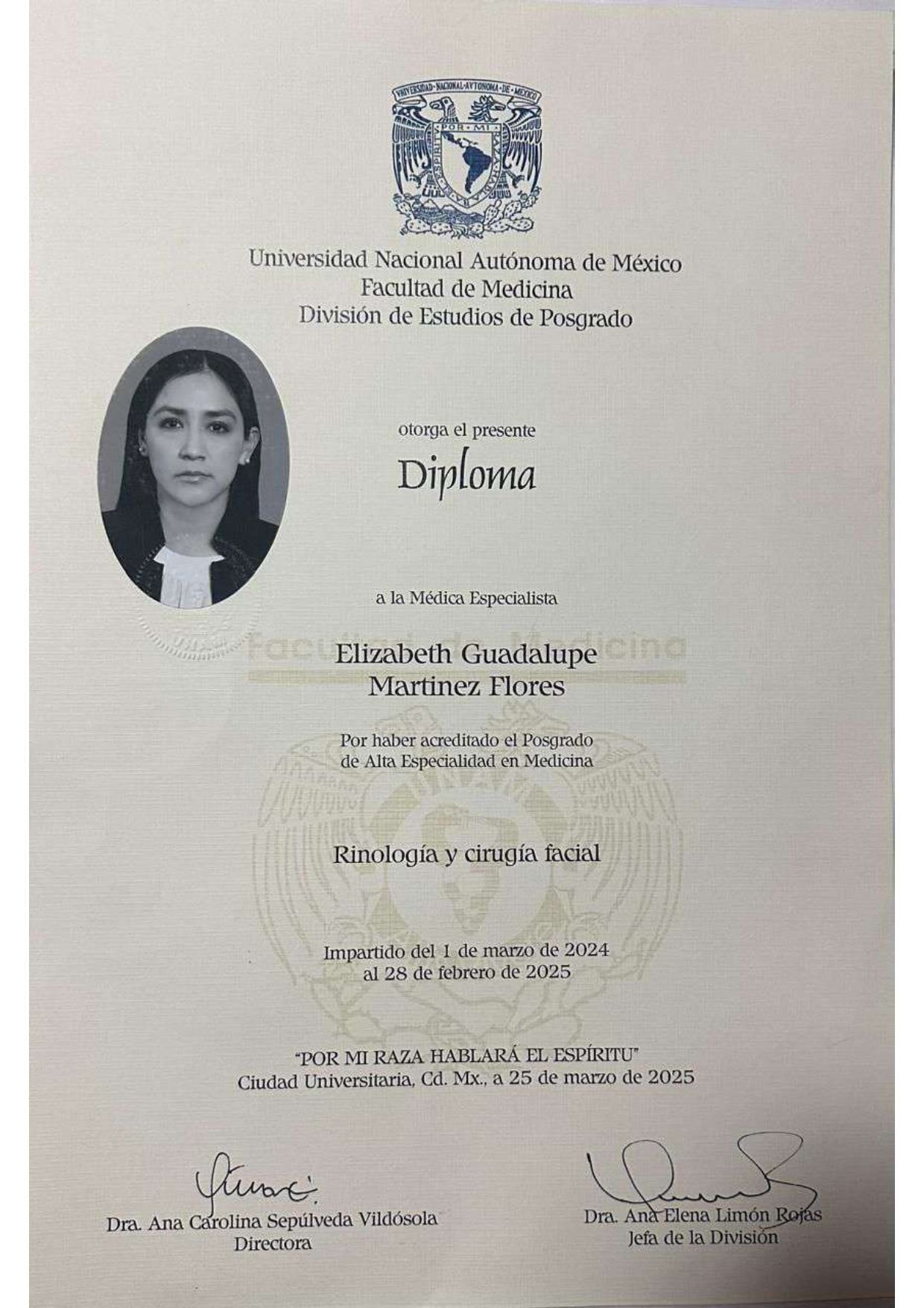 Obtuve una Alta Especialidad en Rinología y Cirugía Plástica Facial, certificada por la Universidad Nacional Autónoma de México (UNAM) en el Hospital Ángeles Puebla.