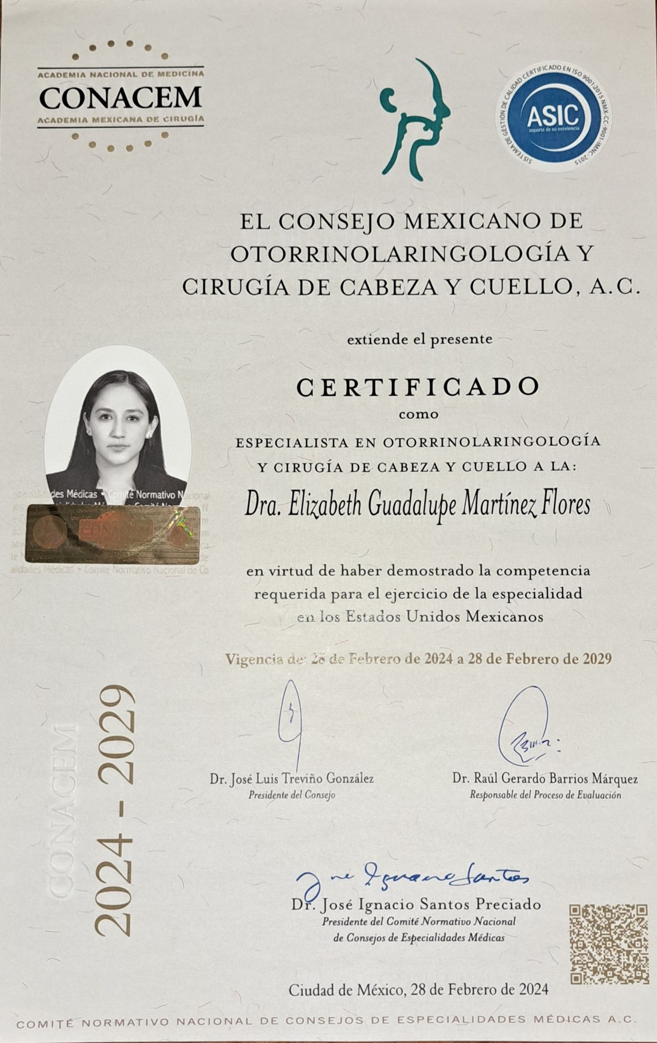 Me encuentro certificada por el Consejo Mexicano de Otorrinolaringología y Cirugía de Cabeza y Cuello, A. C.