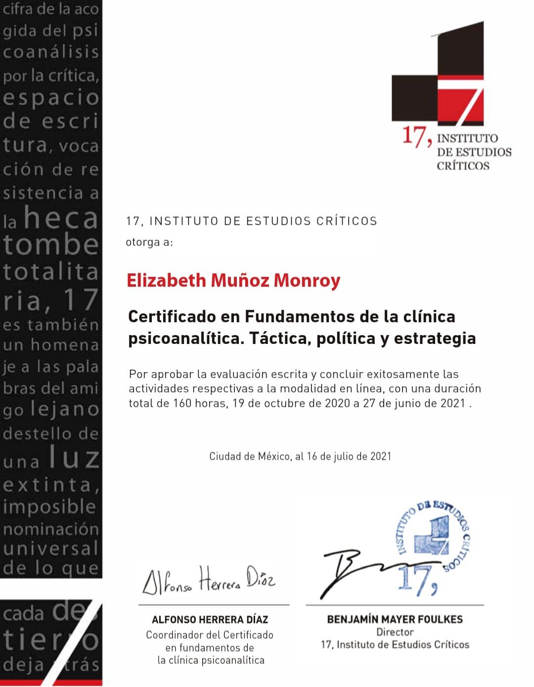 Ψ Certificación en Psicoanálisis por 17, Instituto de Estudios Críticos