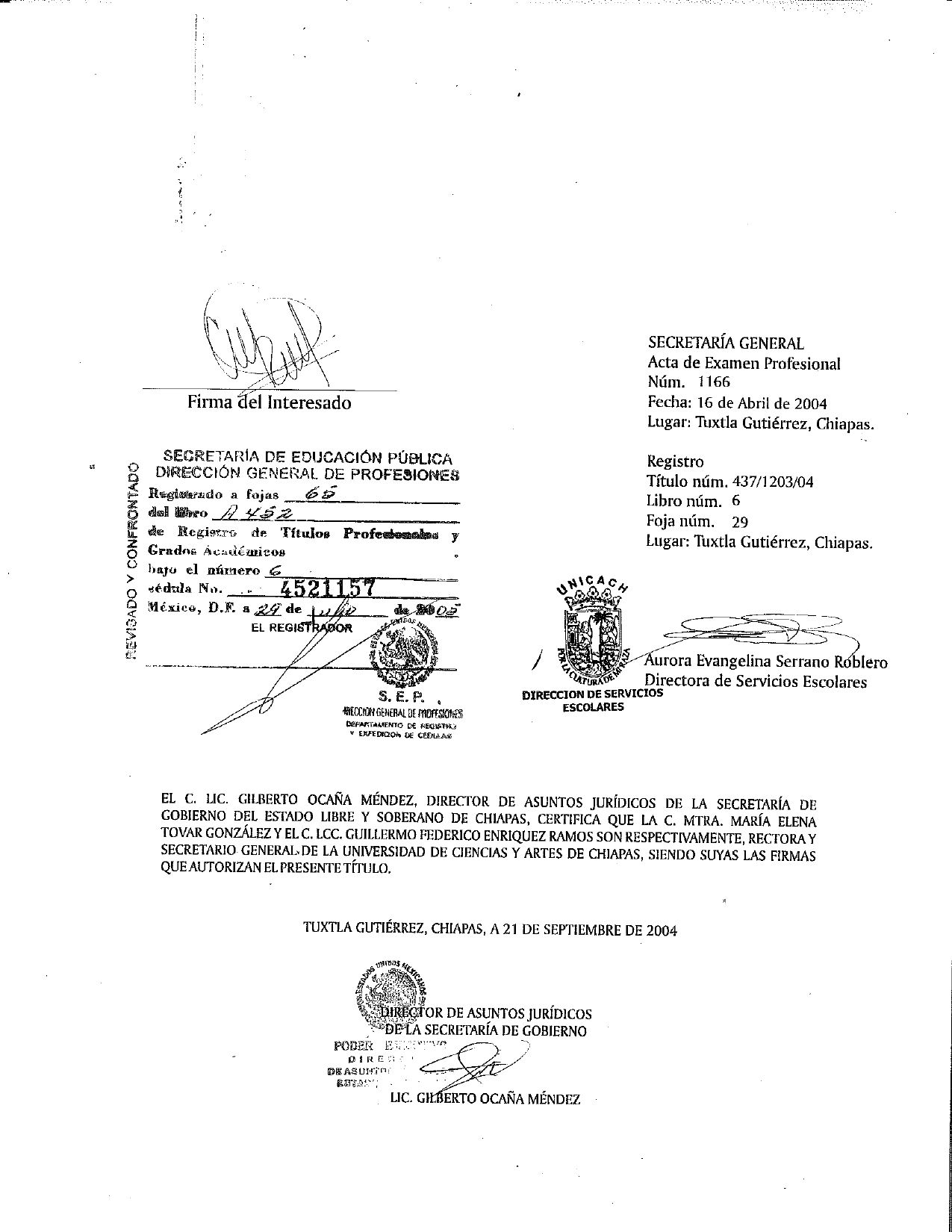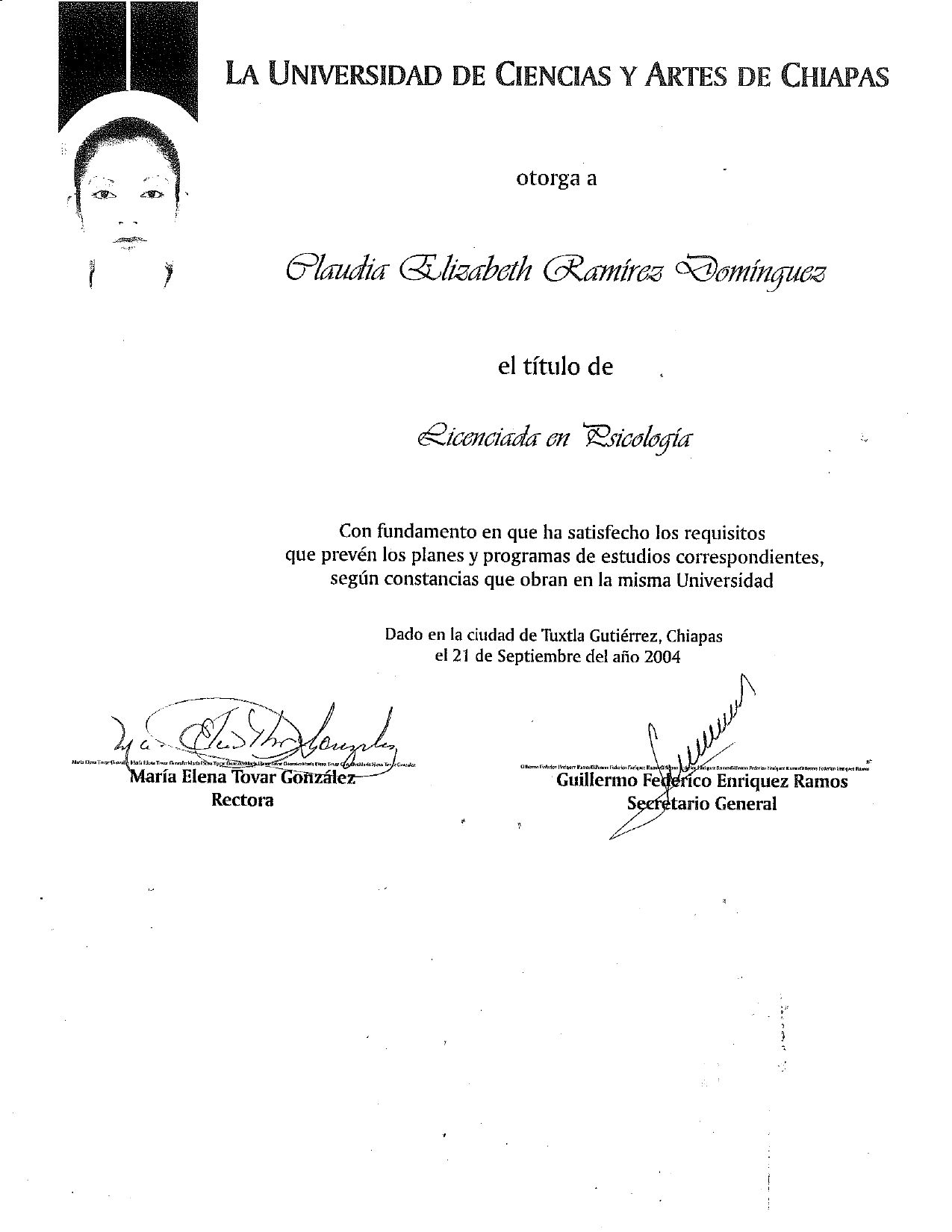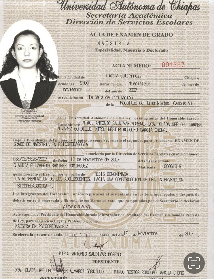 Dra. en Ecología y Desarrollo Sustentable por El Colegio de la Frontera Sur. Maestría en Psicopedagogía con especialidad en Desarrollo de Habilidades del Pensamiento. Maestría en Psicoterapia Gestalt. Formación en Terapia Psico-Corporal. Licenciatura en Psicología por la Universidad de Ciencias y Artes de Chiapas.