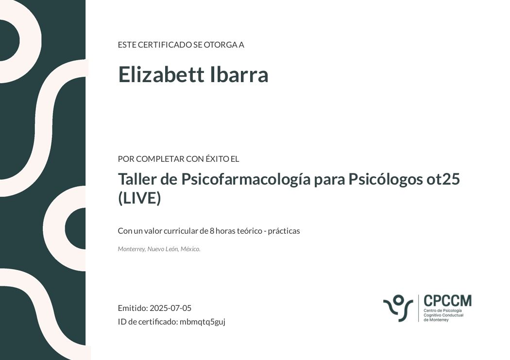 ▪︎ Egresada de la Facultad de Psicología de la UANL. ▪︎ 13 años de experiencia en el ámbito organizacional como reclutadora. ▪︎ 7 años de experiencia en psicoterapia con adultos. ▪︎ Diplomado en Terapia Cognitivo Conductual y Terapias de Tercera Generación. ▪︎ Curso- Taller de Primeros Auxilios Psicológico ▪︎ Entrenamiento de habilidades de Terapia Dialéctica Conductual para terapeutas. ▪︎ Coordinadora de grupo para entrenamiento de habilidades basado en Dialéctica Conductual. ▪︎ Certificación de Liderazgo Orientado a las personas. ▪︎ Certificación de Liderazgo Orientado a los equipos.