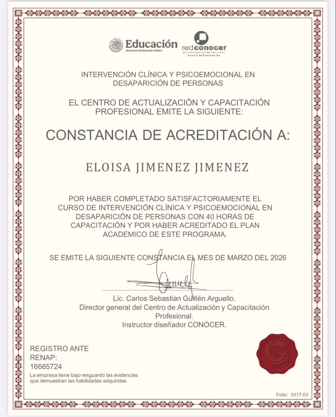Además, tengo experiencia en intervención clínica y acompañamiento psicoemocional en contextos de desaparición de personas, lo que me ha permitido desarrollar una sensibilidad profunda ante el dolor humano en sus formas más complejas, acompañando procesos de duelo ambiguo, incertidumbre y sufrimiento prolongado con respeto y contención especializada.