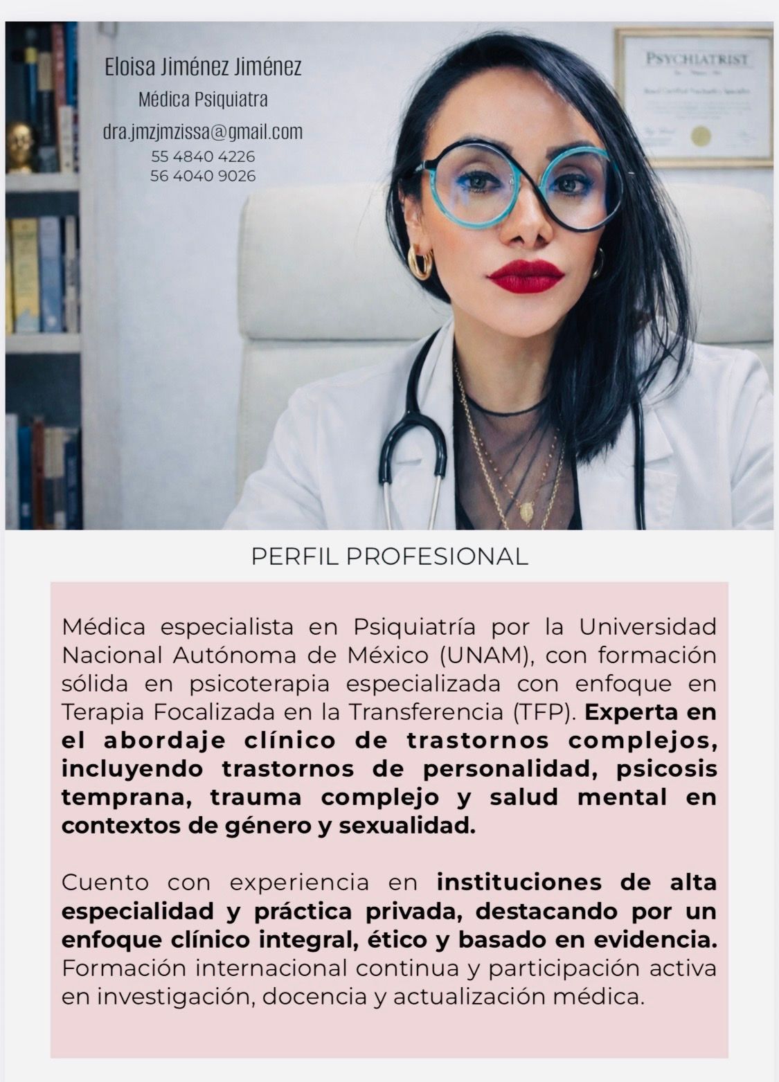 Soy médica cirujana y psiquiatra, profundamente comprometida con el cuidado de la salud mental desde una mirada integral, ética y profundamente humana. Mi práctica se basa en el respeto, la dignidad y la comprensión genuina de cada persona, reconociendo que detrás de cada síntoma hay una historia que merece ser escuchada sin juicios.