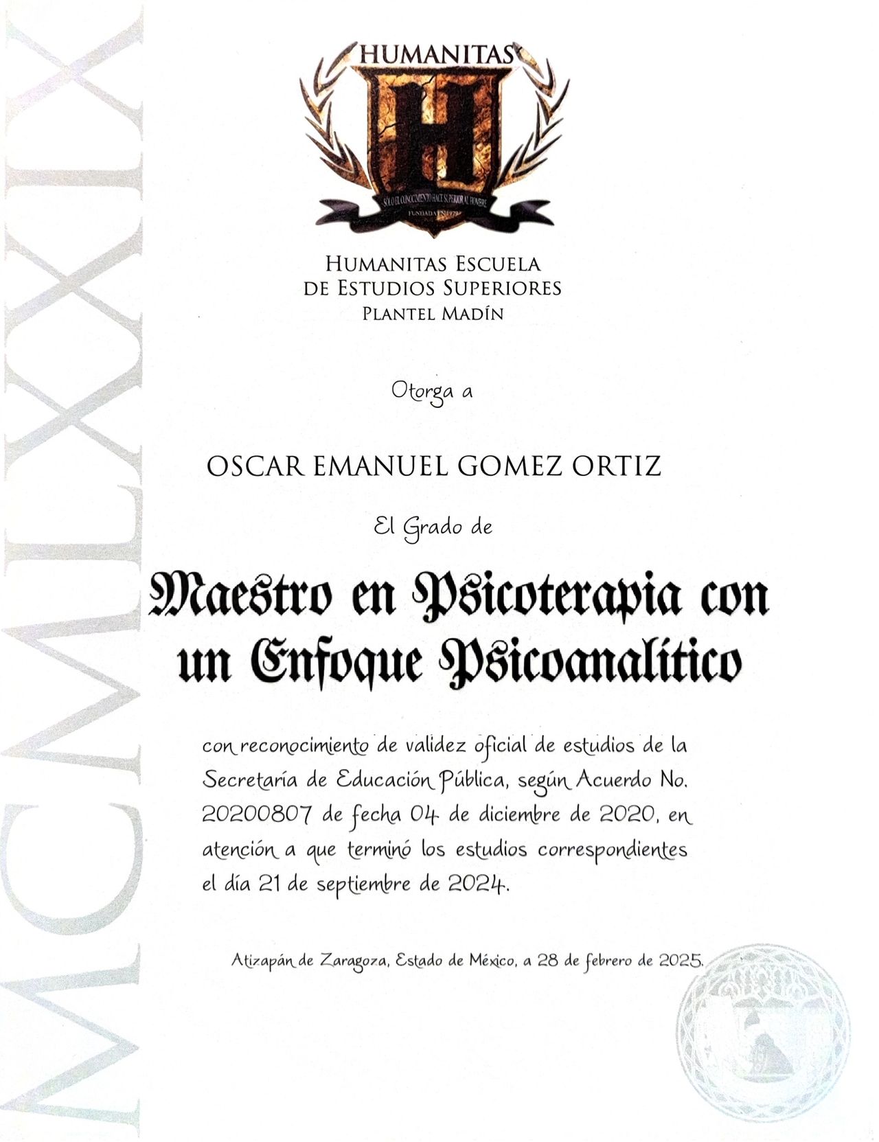 Soy Emanuel Gómez Ortiz, psicólogo con título desde 2017 y maestría en psicoanálisis, sumando más de 8 años de experiencia en psicoterapia. Aunque mi especialidad es psicoanálisis, también integro técnicas de terapia cognitivo-conductual y terapia breve sistémica, personalizando el tratamiento según las necesidades de cada persona. Mi misión es apoyar a las personas en su autoconocimiento y en la superación de desafíos emocionales, ofreciendo un entorno seguro y comprensivo en cada consulta.