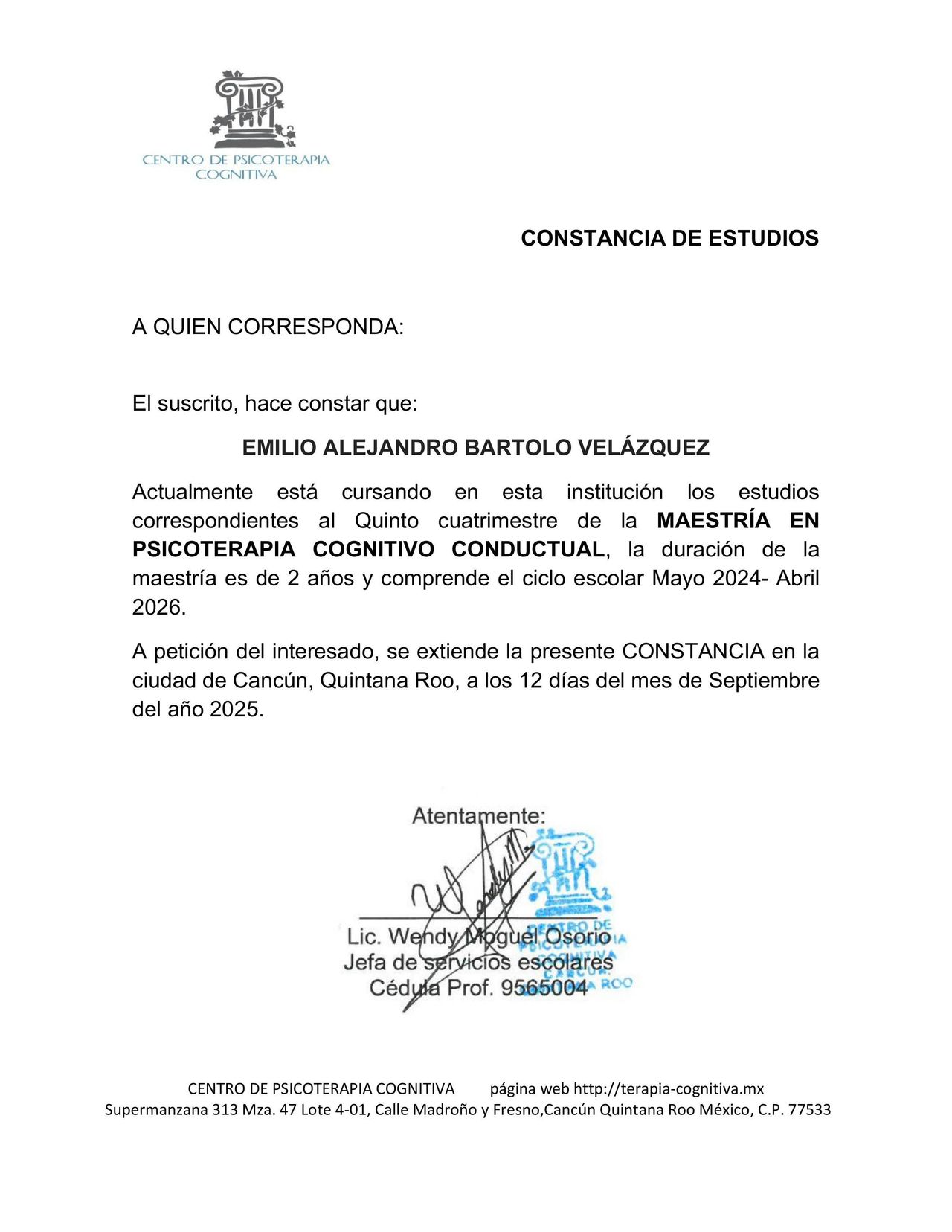 Cuento con una Licenciatura en Psicología, una Maestría en Psicología Clínica para Adultos y un Doctorado en Ciencias Sociales. Estoy especializado en Terapia Cognitivo-Conductual, Terapia de Esquemas y Activación Conductual, enfoques reconocidos internacionalmente por su eficacia.