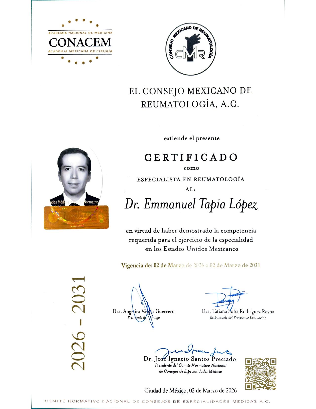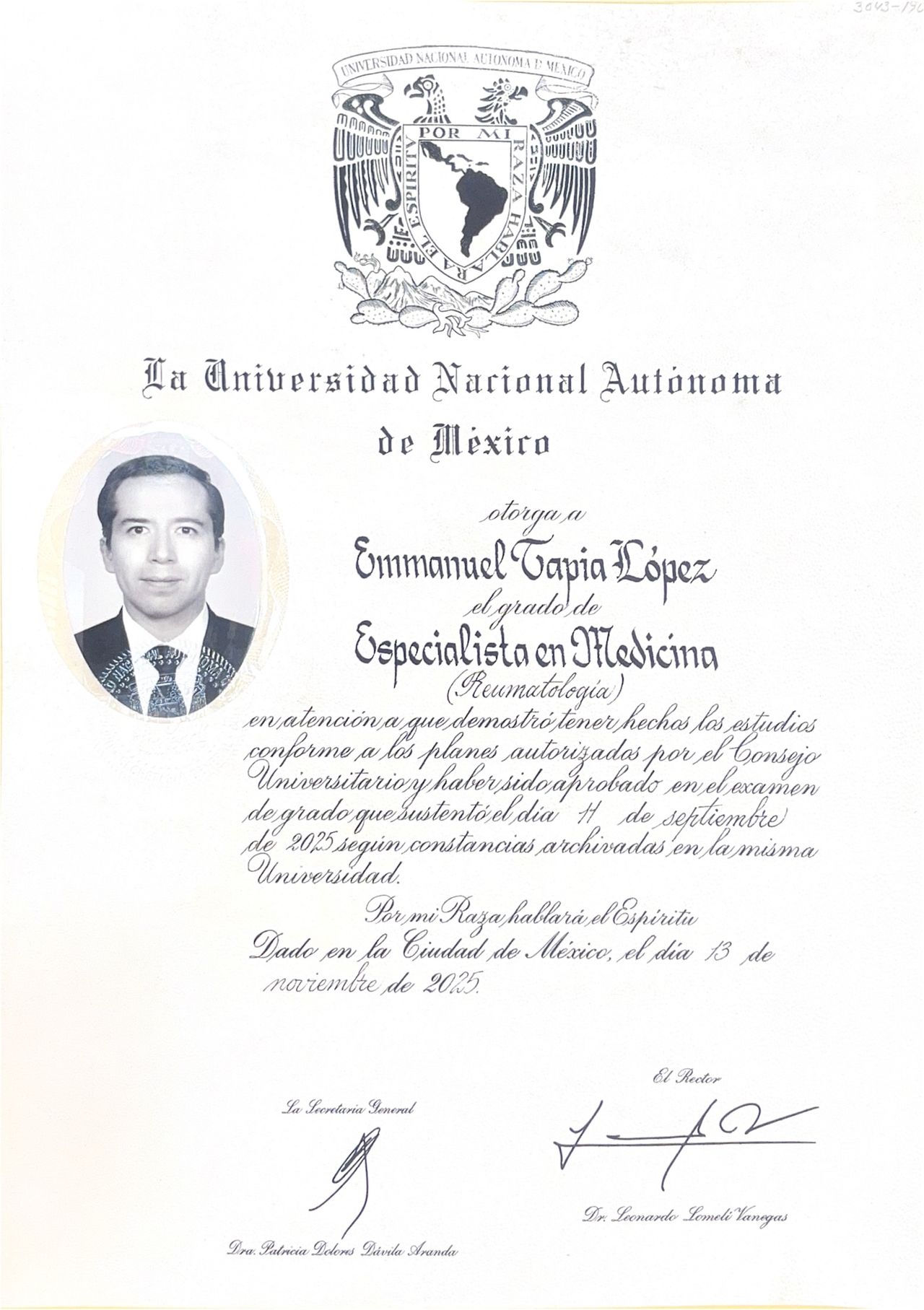 Recomiendo ampliamente al Dr. Emmanuel Tapia, excelente reumatólogo. Es un médico muy profesional, con diagnósticos acertados y una gran calidad humana. Su sensibilidad y empatía hacen que cada consulta sea cercana y clara. Explica todo a detalle, con mucha disponibilidad y con escucha activa hacia los pacientes. Sin duda, un especialista altamente preparado.