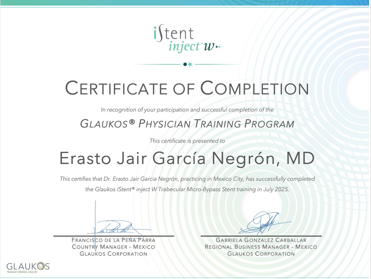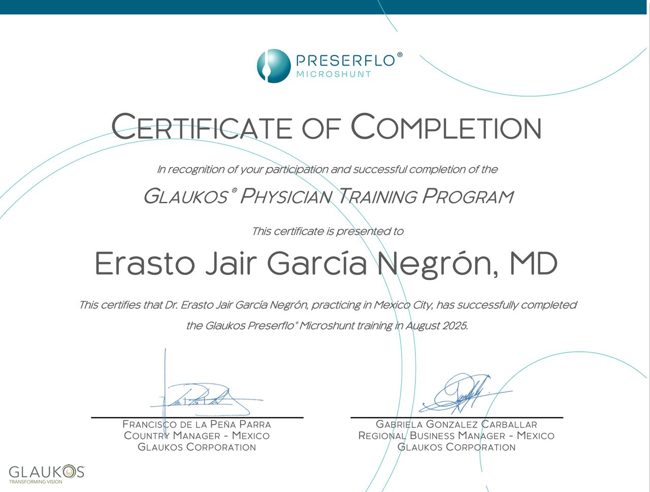 También cuento con experiencia en cirugía de mínima invasión para glaucoma (MIGS), una alternativa quirúrgica moderna que permite controlar la presión ocular con procedimientos menos invasivos en pacientes seleccionados.