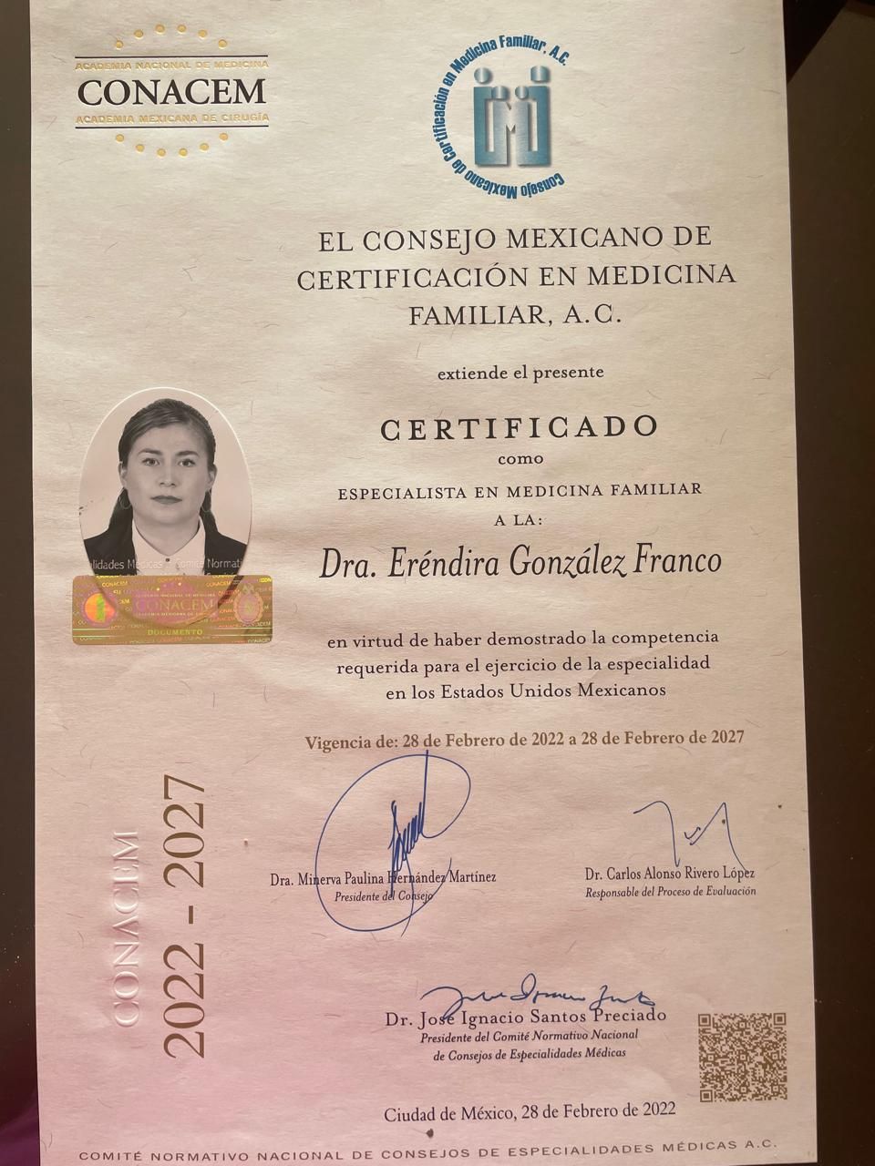 Certificada por el Consejo Mexicano de Certificacion en Medicina Familiar A.C.